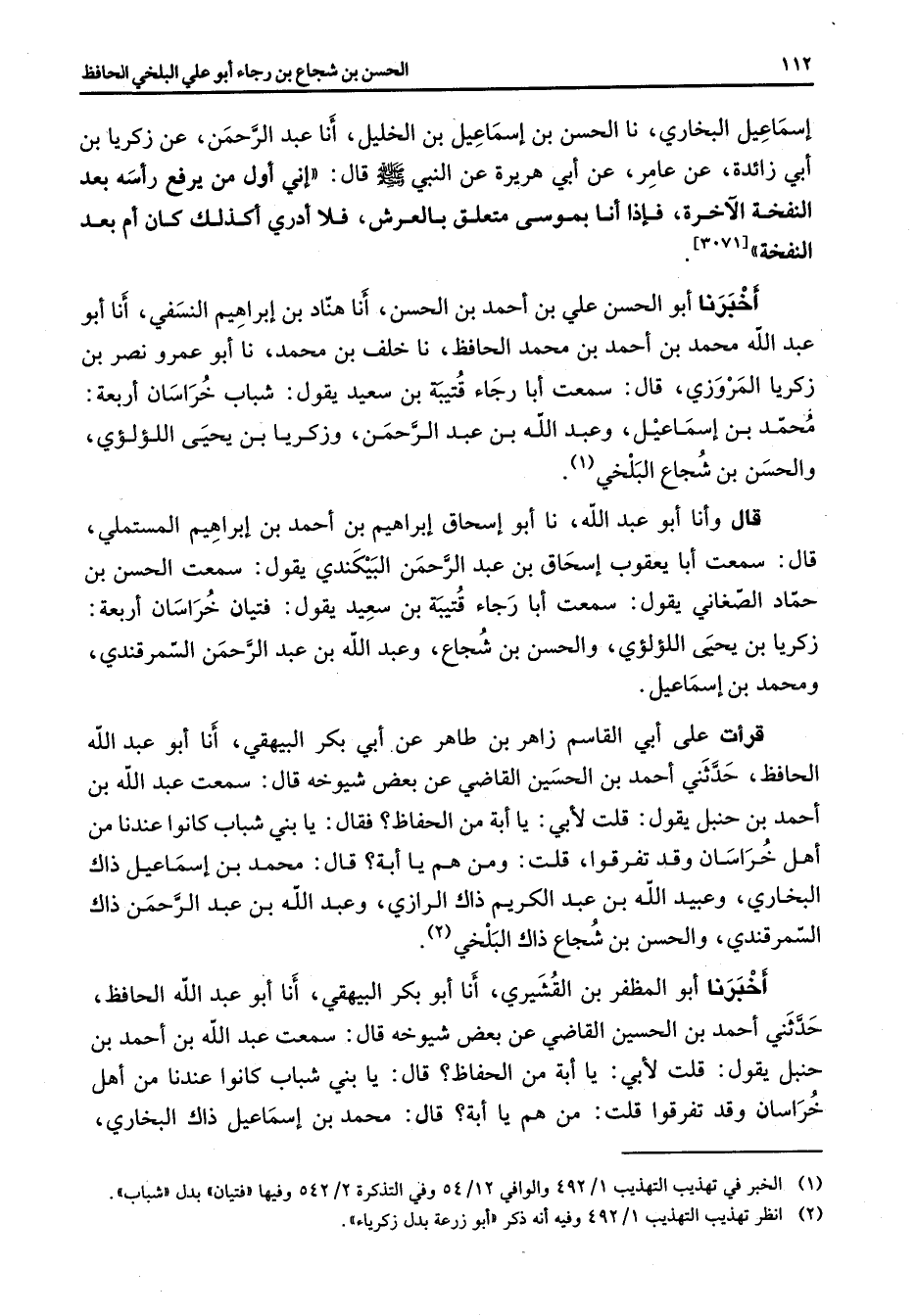 إسماعيل البخاري نا الحسن بن إسماعيل بن الخليل أنا عبد الرحمن عن زكريا بن أبي زائدة عن عامر عن أبي هريرة عن النبي (صلى الله عليه وسلم) قال إني أول من يرفع رأسه بعد النفخة الآخرة فإذا أنا بموسى متعلق بالعرش فلا أدري أكذلك كان أم بعد النفخة أخبرنا أبو الحسن علي بن أحمد بن الحسن أنا هناد بن إبراهيم النسفي أنا أبو عبد الله محمد بن أحمد بن محمد الحافظ نا خلف بن محمد نا أبو عمرو نصر بن زكريا المروزي قال سمعت أبا رجاء قتيبة بن سعيد يقول شباب خراسان أربعة محمد بن إسماعيل وعبد الله بن عبد الرحمن وزكريا بن يحيى اللؤلؤي والحسن بن شجاع البلخي (1)