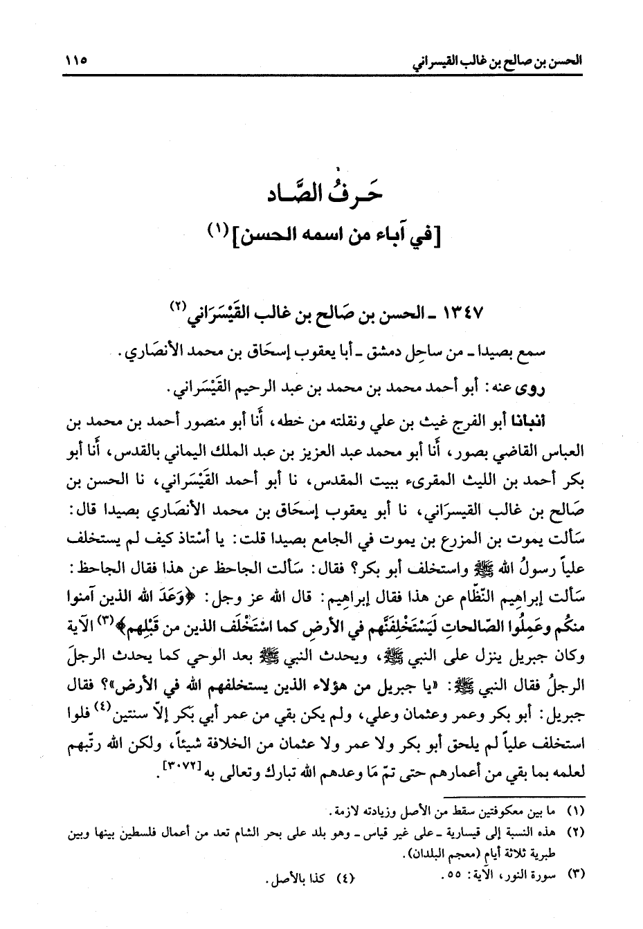 " حرف الصاد في آباء من اسمه الحسن " (1) 1347 - الحسن بن صالح بن غالب القيسراني (2) سمع بصيدا من ساحل دمشق أبا يعقوب إسحاق بن محمد الأنصاري روى عنه أبو أحمد محمد بن محمد بن عبد الرحيم القيسراني أنبأنا أبو الفرج غيث بن علي ونقلته من خطه أنا أبو منصور أحمد بن محمد بن العباس القاضي بصور أنا أبو محمد عبد العزيز بن عبد الملك اليماني بالقدس أنا أبو بكر أحمد بن الليث المقرئ ببيت المقدس نا أبو أحمد القيسراني نا الحسن بن صالح بن غالب القيسراني نا أبو يعقوب إسحاق بن محمد الأنصاري بصيدا قال سألت يموت بن المزرع بن يموت في الجامع بصيدا قلت يا أستاذ كيف لم يستخلف عليا رسول الله (صلى الله عليه وسلم) واستخلف أبو بكر فقال سألت الجاحظ عن هذا فقال الجاحظ سألت إبراهيم النظام عن هذا فقال إبراهيم قال الله عز وجل " وعد الله الذين آمنوا منكم وعملوا الصالحات ليستخلفنهم في الأرض كما استخلف الذين من قبلهم " (3) الآية وكان جبريل ينزل على النبي (صلى الله عليه وسلم) ويحدث النبي (صلى الله عليه وسلم) بعد الوحي كما يحدث الرجل الرجل فقال النبي (صلى الله عليه وسلم) يا جبريل من هؤلاء الذين يستخلفهم الله في الأرض فقال جبريل أبو بكر وعمر وعثمان وعلي ولم يكن بقي من عمر أبي بكر إلا سنتين (4) فلوا استخلف عليا لم يلحق أبو بكر ولا عمر ولا عثمان من الخلافة شيئا ولكن الله رتبهم لعلمه بما بقي من أعمارهم حتى تم ما وعدهم الله تبارك وتعالى به