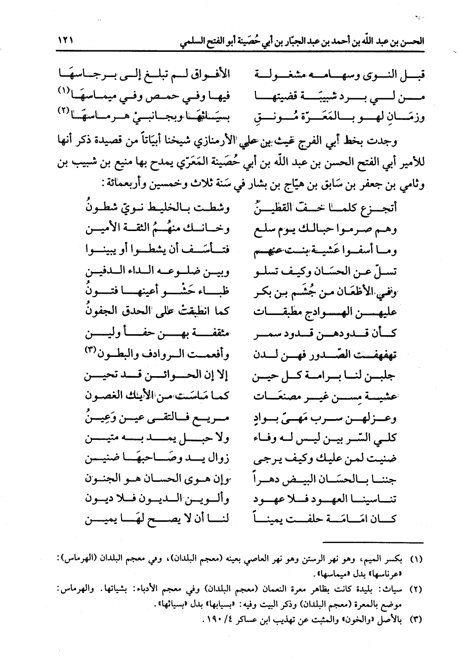 قبل النوى وسهامه مشغولة * الأفواق لم تبلغ إلى برجاسها من لي برد شبيبة قضيتها * فيها وفي حمص وفي ميماسها (1) وزمان لهو بالمعرة مونق * بسياثها وبجانبي هرماسها * (2) وجدت بخط أبي الفرج غيث بن علي الأرمنازي شيخنا أبياتا من قصيدة ذكر أنها للأمير أبي الفتح الحسن بن عبد الله بن أبي حصينة المعري يمدح منيع بن شبيب بن وثامي بن جعفر بن سابق بن هياج بن بشار في سنة ثلاث وخمسين وأربعمائة: * أتجزع كلما خف القطين * وشطت بالخليط نوي شطون وهم صرموا حبالك يوم سلع * وخانك منهم الثقة الأمين وما أسفوا عشية بنت عنهم * فتأسف أن يشطوا أو يبينوا تسل عن الحسان وكيف تسلو * وبين ضلوعه الداء الدفين وفي الأظعان من جشم بن بكر * ظباء حشو أعينها فتون عليهن الهوادج مطبقات * كما انطبقت على الحدق الجفون كأن قدودهن قدود سمر * مثقفة بهن حفأ ولين تهفهفت الصدور فهن لدن * وأفعمت الروادف والبطون (3) * * جلبن لنا برامة كل حين * إلا أن الحوائن قد تحين عشية مسن غير مصنعات * كما ماست من الأيك الغصون وعزلهن سرب مهى بواد * مريع فالتقى عين وعين كلي السر بين ليس له وفاء * ولا حبل يمد به متين ضنيت لمن عليك وكيف يرجى * زوال يد وصاحبها ضنين جننا بالحسان البيض دهرا * وإن هوى الحسان هو الجنون تناسينا العهود فلا عهود * وألوين الديون فلا ديون كان أمامة حلفت يمينا * لنا أن لا يصلح لها يمين