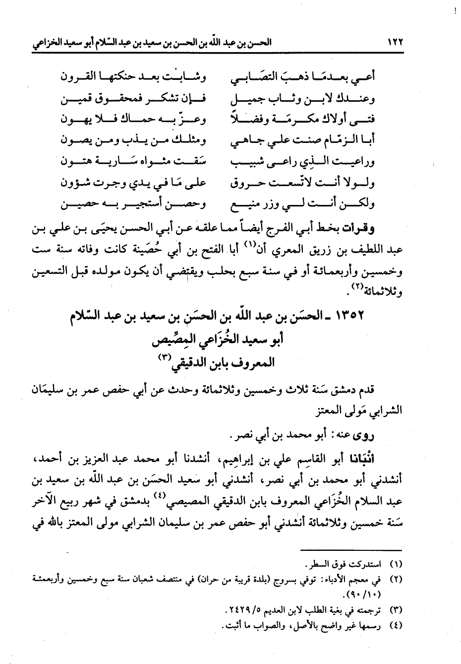1352 - الحسن بن عبد الله بن الحسن بن سعيد بن عبد السلام أبو سعيد الخزاعي المصيص المعروف بابن الدقيقي (3) قدم دمشق سنة ثلاث وخمسين وثلاثمائة وحدث عن أبي حفص عمر بن سليمان الشرابي مولى المعتز روى عنه أبو محمد بن أبي نصر أنبأنا أبو القاسم علي بن إبراهيم أنشدنا أبو محمد عبد العزيز بن أحمد أنشدني أبو محمد بن أبي نصر أنشدني أبو سعيد الحسن بن عبد الله بن سعيد بن عبد السلام الخزاعي المعروف بابن الدقيقي المصيصي بدمشق في شهر ربيع الآخر سنة خمسين وثلاثمائة أنشدني أبو حفص عمر بن سليمان الشرابي مولى المعتز بالله في