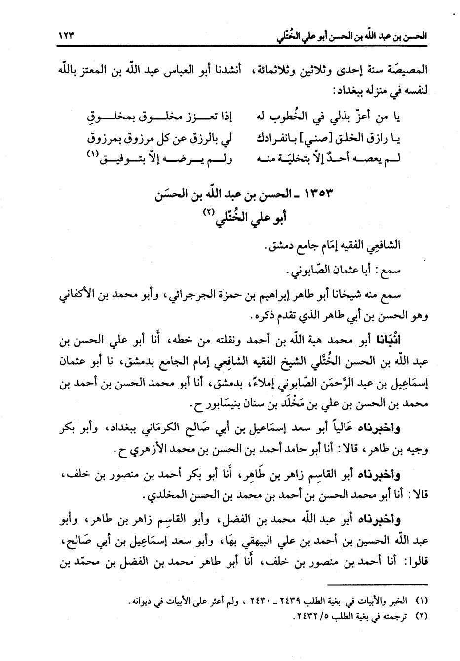 المصيصة سنة إحدى وثلاثين وثلاثمائة أنشدنا أبو العباس عبد الله بن المعتز بالله لنفسه في منزله ببغداد: * يا من أعز بذلي في الخطوب له * إذا تعزز مخلوق بمخلوق يا رازق الخلق صني بانفرادك * لي بالرزق عن كل مرزوق بمرزوق لم يعصه أحد إلا بتخلية منه * ولم يرضه إلا بتوفيق * (1) 1353 - الحسن بن عبد الله بن الحسن أبو علي الختلي (2) الشافعي الفقيه إمام جامع دمشق سمع أبا عثمان الصابوني سمع منه شيخانا أبو طاهر إبراهيم بن حمزة الجرجاني وأبو محمد بن الأكفاني وهو الحسن بن أبي طاهر الذي تقدم ذكره أنبأنا أبو محمد هبة الله بن أحمد ونقلته من خطه أنا أبو علي الحسن بن عبد الله بن الحسن الختلي الشيخ الفقيه الشافعي إمام الجامع بدمشق نا أبو عثمان إسماعيل بن عبد الرحمن الصابوني إملاء بدمشق أنا أبو محمد الحسن بن أحمد بن محمد بن الحسن بن علي بن مخلد بن سنان بنيسابور وأخبرناه عاليا أبو سعد إسماعيل بن أبي صالح الكرماني ببغداد وأبو بكر وجيه بن طاهر قالا أنا أبو حامد أحمد بن الحسن بن محمد الأزهري ح وأخبرناه أبو القاسم زاهر بن طاهر أنا أبو بكر أحمد بن منصور بن خلف قالا أنا أبو محمد الحسن بن أحمد بن محمد بن الحسن المخلدي وأخبرناه أبو عبد الله محمد بن الفضل وأبو القاسم زاهر بن طاهر وأبو عبد الله الحسين بن أحمد بن علي البيهقي بها وأبو سعد إسماعيل بن أبي صالح قالوا أنا أحمد بن منصور بن خلف أنا أبو طاهر محمد بن الفضل بن محمد بن
