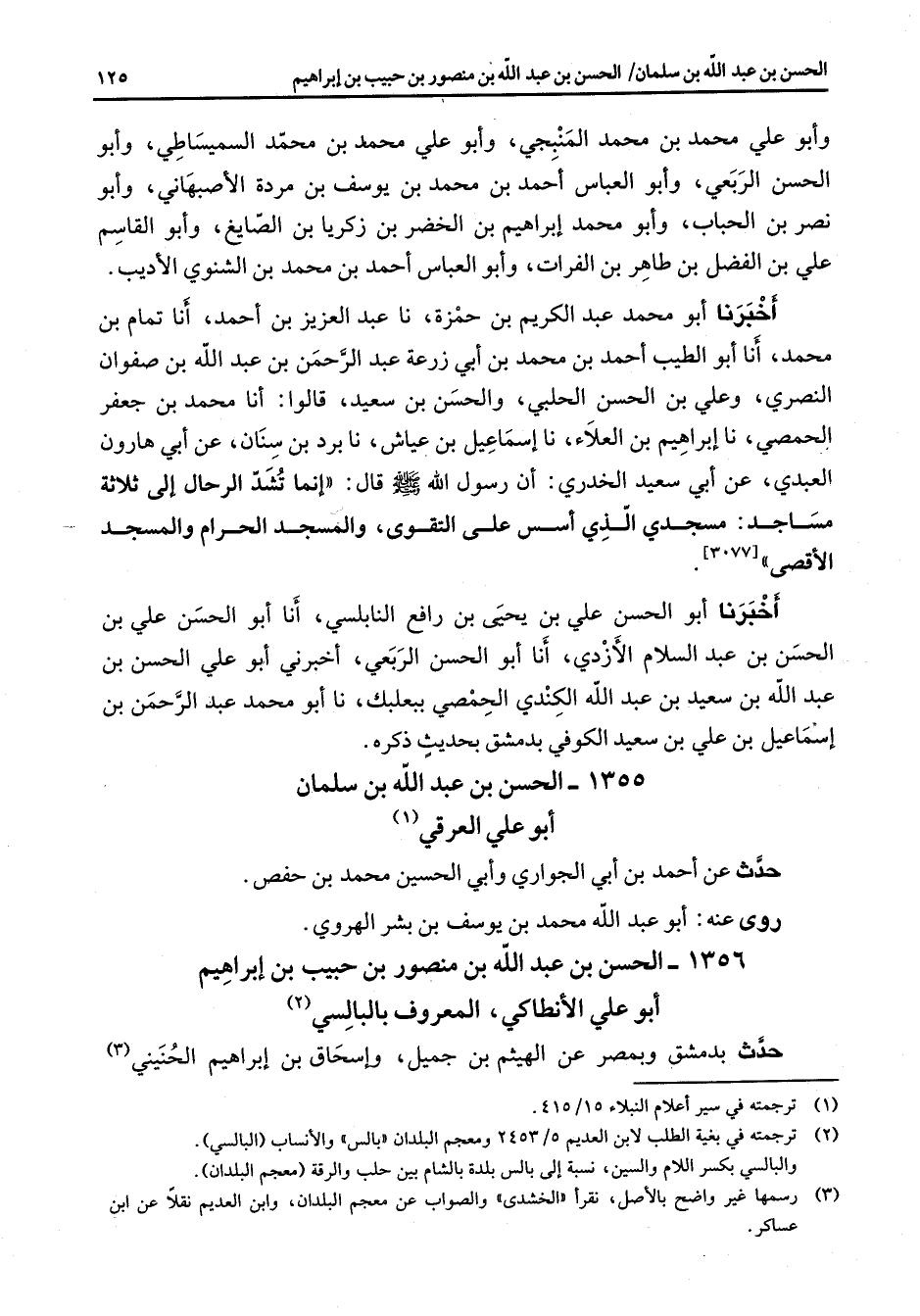 وأبو علي محمد بن محمد المنبجي وأبو علي محمد بن محمد السمسياطي وأبو الحسن الربعي وأبو العباس أحمد بن محمد بن يوسف بن مردة الأصبهاني وأبو نصر بن الحباب وأبو محمد إبراهيم بن الخضر بن زكريا بن الصايغ وأبو القاسم علي بن الفضل بن طاهر بن الفرات وأبو العباس أحمد بن محمد بن الشنوي الأديب أخبرنا أبو محمد عبد الكريم بن حمزة نا عبد العزيز بن أحمد أنا تمام بن محمد أنا أبو الطيب أحمد بن محمد بن أبي زرعة عبد الرحمن عبد الرحمن بن عبد الله بن صفوان النصري وعلي بن الحسن الحلبي والحسن بن سعيد قالوا أنا محمد بن جعفر الحمصي نا إبراهيم بن العلاء نا إسماعيل بن عياش نا برد بن سنان عن أبي هارون العبدي عن أبي سعيد الخدري أن رسول الله (صلى الله عليه وسلم) قال إنما تشد الرحال إلى ثلاثة مساجد مسجدي الذي أسس على التقوى والمسجد الحرام والمسجد الأقصى أخبرنا أبو الحسن علي بن يحيى بن رافع النابلسي أنا أبو الحسن علي بن الحسن بن عبد السلام الأزدي أنا أبو الحسن الربعي أخبرني أبو علي الحسن بن عبد الله بن سعيد بن عبد الله الكندي الحمصي ببعلبك نا أبو محمد عبد الرحمن بن إسماعيل بن علي بن سعيد الكوفي بدمشق بحديث ذكره 1355 - الحسن بن عبد الله بن سلمان أبو علي العرقي (1) حدث عن أحمد بن أبي الجواري وأبي الحسين محمد بن حفص روى عنه أبو عبد الله محمد بن يوسف بن بشر الهروي