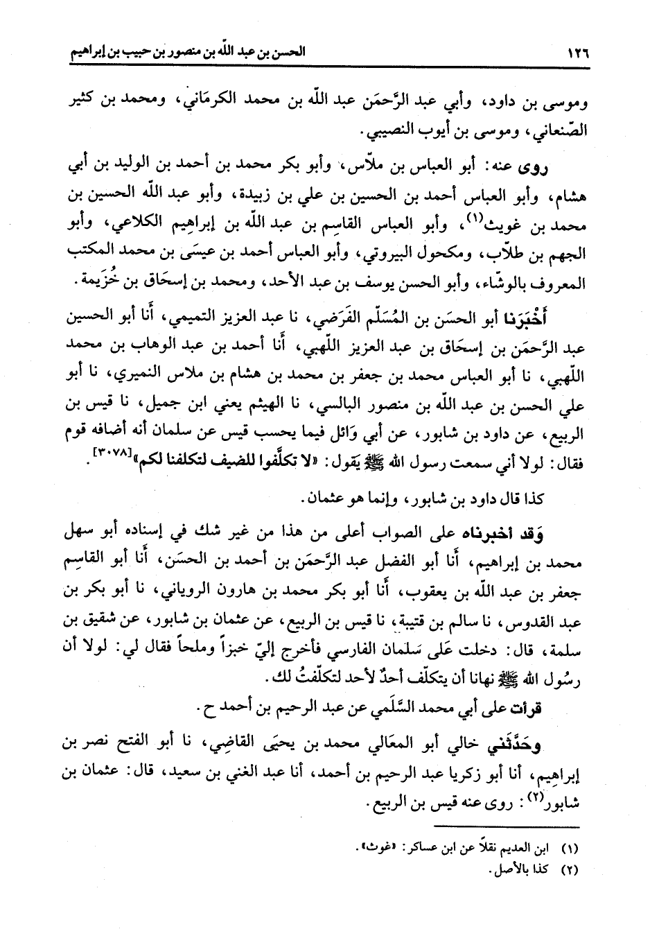 وموسى بن داود وأبي عبد الرحمن عبد الله بن محمد الكرماني ومحمد بن كثير الصنعاني وموسى بن أيوب النصيبي روى عنه أبو العباس بن ملاس وأبو بكر محمد بن أحمد بن الوليد بن أبي هشام وأبو العباس أحمد بن الحسين بن علي بن زبيدة وأبو عبد الله الحسين بن محمد بن غويث (1) وأبو العباس القاسم بن عبد الله بن إبراهيم الكلاعي وأبو الجهم بن طلاب ومكحول البيروتي وأبو العباس أحمد بن عيسى بن محمد المكتب المعروف بالوشاء وأبو الحسن يوسف بن عبد الأحد ومحمد بن إسحاق بن خزيمة أخبرنا أبو الحسن بن المسلم الفرضي نا عبد العزيز التميمي أنا أبو الحسين عبد الرحمن بن إسحاق بن عبد العزيز اللهبي أنا أحمد بن عبد الوهاب بن محمد اللهبي نا أبو العباس محمد بن جعفر بن محمد بن هشام بن ملاس النميري نا أبو علي الحسن بن عبد الله بن منصور البالسي نا الهيثم يعني ابن جميل نا قيس بن الربيع عن داود بن شابور عن أبي وائل فيما يحسب قيس عن سلمان أنه أضافه قوم فقال لولا أني سمعت رسول الله (صلى الله عليه وسلم) يقول لا تكلفوا للضيف لتكلفنا لكم كذا قال داود بن شابور وإنما هو عثمان وقد أخبرناه على الصواب أعلى من هذا من غير شك في إسناده أبو سهل محمد بن إبراهيم أنا أبو الفضل عبد الرحمن بن أحمد بن الحسن أنا أبو القاسم جعفر بن عبد الله بن يعقوب أنا أبو بكر محمد بن هارون الروياني نا أبو بكر بن عبد القدوس نا سالم بن قتيبة نا قيس بن الربيع عن عثمان بن شابور عن شقيق بن سلمة قال دخلت على سلمان الفارسي فأخرج إلي خبزا وملحا فقال لي لولا أن رسول الله (صلى الله عليه وسلم) نهانا أن يتكلف أحد لأحد لتكلفت لك قرأت على أبي محمد السلمي عن عبد الرحيم بن أحمد وحدثني خالي أبو المعالي محمد بن يحيى القاضي نا أبو الفتح نصر بن إبراهيم أنا أبو زكريا عبد الرحيم بن أحمد أنا عبد الغني بن سعيد قال عثمان بن شابور (2) : روى عنه قيس بن الربيع