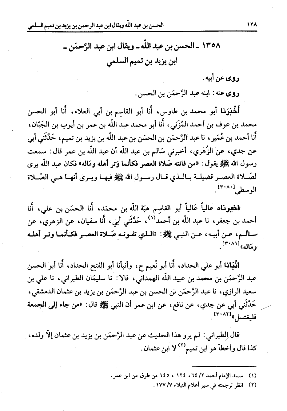 1358 - الحسن بن عبد الله ويقال ابن عبد الرحمن ابن يزيد بن تميم السلمي روى عن أبيه روى عنه ابنه عبد الرحمن بن الحسن أخبرنا أبو محمد بن طاوس أنا أبو القاسم بن أبي العلاء أنا أبو الحسن محمد بن عوف بن أحمد المزني أنا أبو محمد عبد الله بن عمر بن أيوب بن الجبان أنا أحمد بن عمير نا عبد الرحمن بن الحسن بن عبد الله بن يزيد بن تميم حدثني أبي عن جدي عن الزهري أخبرني سالم بن عبد الله أن عبد الله بن عمر قال سمعت رسول الله (صلى الله عليه وسلم) يقول من فاتته صلاة العصر فكأنما وتر أهله وماله فكان عبد الله يرى لصلاة العصر فضيلة بالذي قال رسول الله (صلى الله عليه وسلم) فيها ويرى أنها هي الصلاة الوسطى أخبرناه عاليا عاليا أبو القاسم هبة الله بن محمد أنا الحسن بن علي أنا أحمد بن جعفر نا عبد الله بن أحمد (1) حدثني أبي أنا سفيان عن الزهري عن سالم عن أبيه عن النبي (صلى الله عليه وسلم) الذي تفوته صلاة العصر فكأنما وتر أهله وماله أنبأنا أبو علي الحداد أنا أبو نعيم وأنبأنا أبو الفتح الحداد أنا أبو الحسن عبد الرحمن بن محمد بن عبيد الله الهمداني قالا نا سليمان الطبراني نا علي بن سعيد الرازي نا عبد الرحمن بن الحسن بن عبد الرحمن بن يزيد بن عثمان الدمشقي حدثني أبي عن جدي عن نافع عن ابن عمر أن النبي (صلى الله عليه وسلم) قال من جاء إلى الجمعة فليغتسل قال الطبراني لم يرو هذا الحديث عن عبد الرحمن بن يزيد بن عثمان إلا ولده كذا قال وأخطأ هو ابن تميم (2) لا ابن عثمان