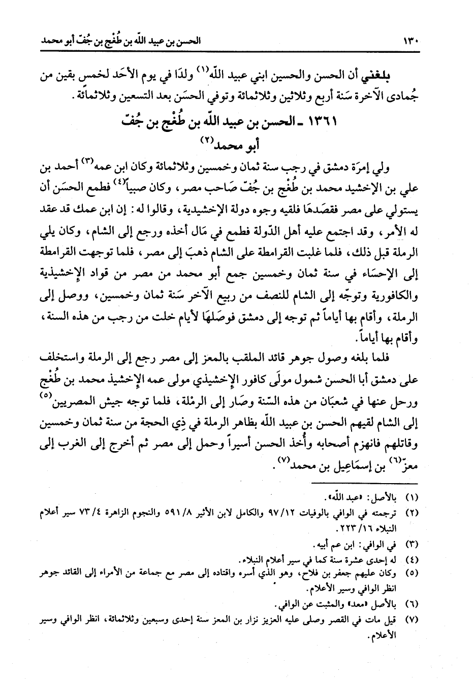 1361 - الحسن بن عبيد الله بن طغج بن جف أبو محمد (2) ولي إمرة دمشق في رجب سنة ثمان وخمسين وثلاثمائة وكان ابن عمه (3) أحمد بن علي بن الإخشيد محمد بن طغج بن جف صاحب مصر وكان صبيا (4) فطمع الحسن أن يستولي على مصر فقصدها فلقيه وجوه دولة الإخشيدية وقالوا له إن ابن عمك قد عقد له الأمر وقد اجتمع عليه أهل الدولة فطمع في مال أخذه ورجع إلى الشام وكان يلي الرملة قبل ذلك فلما غلبت القرامطة على الشام ذهب إلى مصر فلما توجهت القرامطة إلى الأحساء في سنة ثمان وخمسين جمع أبو محمد من مصر من قواد الإخشيدية والكافورية وتوجه إلى الشام للنصف من ربيع الآخر سنة ثمان وخمسين ووصل إلى الرملة وأقام بها أياما ثم توجه إلى دمشق فوصلها لأيام خلت من رجب من هذه السنة وأقام بها أياما فلما بلغه وصول جوهر قائد الملقب بالمعز إلى مصر رجع إلى الرملة واستخلف على دمشق أبا الحسن شمول مولى كافور الإخشيذي مولى عمه الإخشيذ محمد بن طغج ورحل عنها في شعبان من هذه السنة وصار إلى الرملة فلما توجه جيش المصريين (5) إلى الشام لقيهم الحسن بن عبيد الله بظاهر الرملة في ذي الحجة من سنة ثمان وخمسين وقاتلهم فانهزم أصحابه وأخذ الحسن أسيرا وحمل إلى مصر ثم أخرج إلى الغرب إلى معز (6) بن إسماعيل بن محمد (7)