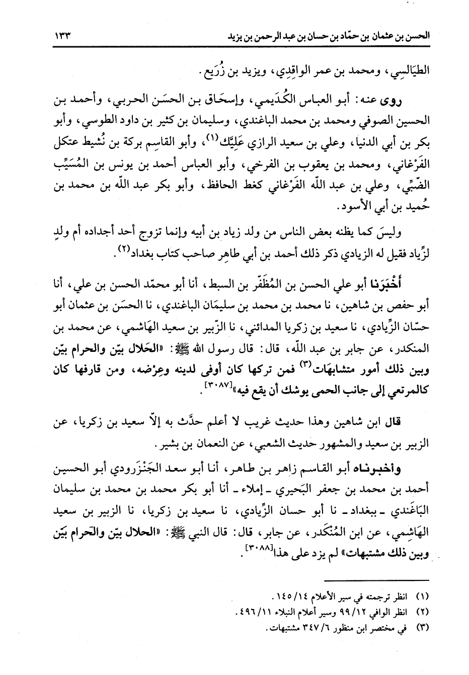 الطيالسي ومحمد بن عمر الواقدي ويزيد بن زريع روى عنه أبو العباس الكديمي وإسحاق بن الحسن الحربي وأحمد بن الحسين الصوفي ومحمد بن محمد الباغندي وسليمان بن كثير بن داود الطوسي وأبو بكر بن أبي الدنيا وعلي بن سعيد الرازي عليك (1) وأبو القاسم بركة بن نشيط عتكل الفرغاني ومحمد بن يعقوب بن الفرخي وأبو العباس أحمد بن يونس بن المسيب الضبي وعلي بن عبد الله الفرغاني كغط الحافظ وأبو بكر عبد الله بن محمد بن حميد بن أبي الأسود وليس كما يظنه بعض الناس من ولد زياد بن أبيه وإنما تزوج أحد أجداده أم ولد لزياد فقيل له الزيادي ذكر ذلك أحمد بن أبي طاهر صاحب كتاب بغداد (2) أخبرنا أبو علي الحسن بن المظفر بن السبط أنا أبو محمد الحسن بن علي أنا أبو حفص بن شاهين نا محمد بن محمد بن سليمان الباغندي نا الحسن بن عثمان أبو حسان الزيادي نا سعيد بن زكريا المدائني نا الزبير بن سعيد الهاشمي عن محمد بن المنكدر عن جابر بن عبد الله قال قال رسول الله (صلى الله عليه وسلم) الحلال بين والحرام بين وبين ذلك أمور متشابهات (3) فمن تركها كان أوفى لدينه وعرضه ومن قارفها كان كالمرتعي إلى جانب الحمى يوشك أن يقع فيه قال ابن شاهين وهذا حديث غريب لا أعلم حدث به إلا سعيد بن زكريا عن الزبير بن سعيد والمشهور حديث الشعبي عن النعمان بن بشير وأخبرناه أبو القاسم زاهر بن طاهر أنا أبو سعد الجنزرودي أبو الحسين أحمد بن محمد بن جعفر البحيري إملاء أنا أبو بكر محمد بن محمد بن سليمان الباغندي ببغداد نا أبو حسان الزيادي نا سعيد بن زكريا نا الزبير بن سعيد الهاشمي عن ابن المنكدر عن جابر قال قال النبي (صلى الله عليه وسلم) الحلال بين والحرام بين وبين ذلك مشتبهات لم يزد على هذا