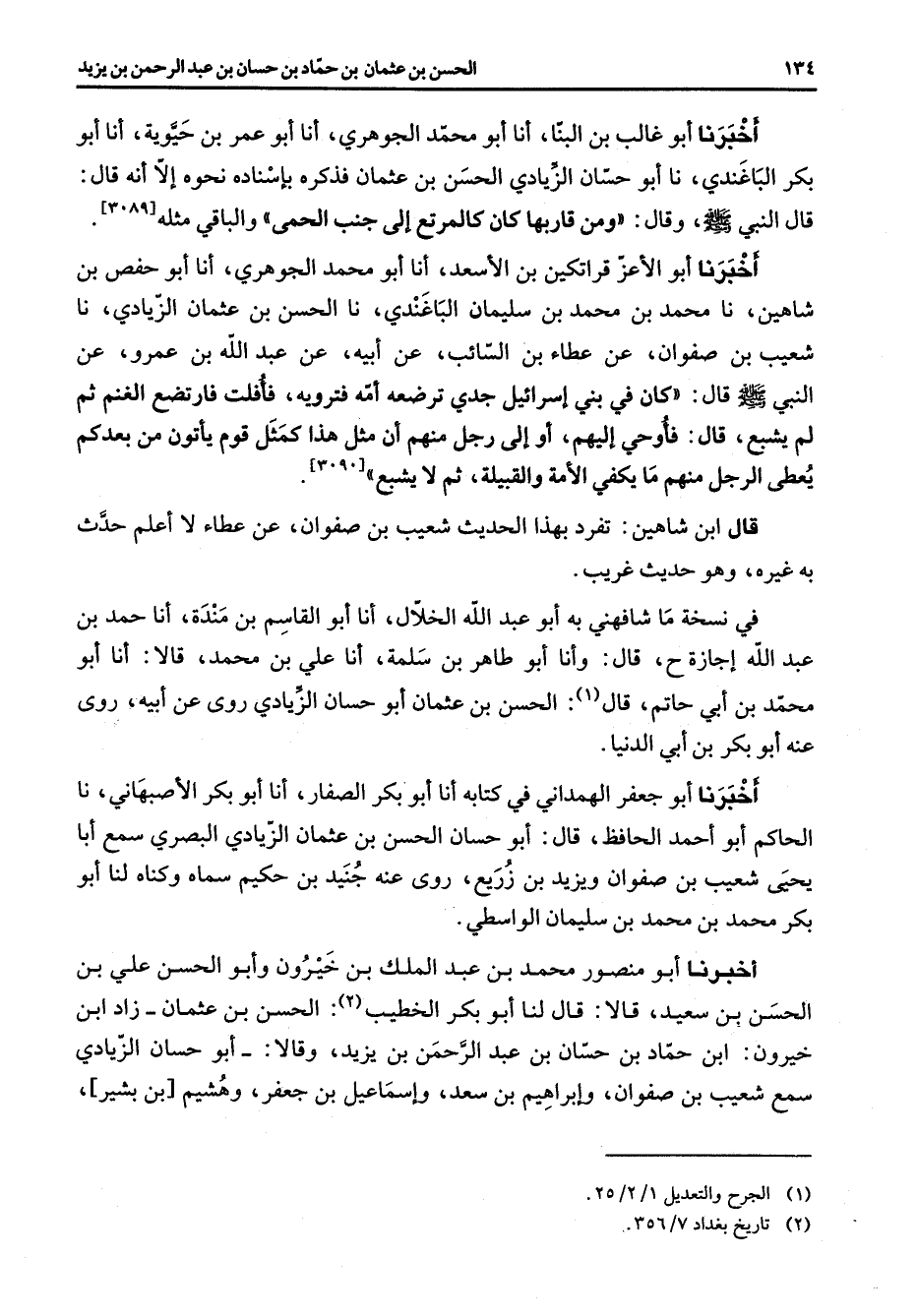 أخبرنا أبو غالب بن البنا أنا أبو محمد الجوهري أنا أبو عمر بن حيوية أنا أبو بكر الباغندي نا أبو حسان الزيادي الحسن بن عثمان فذكره بإسناده نحوه الا أنه قال قال النبي (صلى الله عليه وسلم) وقال ومن قاربها كان كالمرتع إلى جنب الحمى والباقي مثله أخبرنا أبو الأعز قراتكين بن الأسعد أنا أبو محمد الجوهري أنا أبو حفص بن شاهين نا محمد بن محمد بن سليمان الباغندي نا الحسن بن عثمان الزيادي نا شعيب بن صفوان عن عطاء بن السائب عن أبيه عن عبد الله بن عمرو عن النبي (صلى الله عليه وسلم) قال كان في بني إسرائيل جدي ترضعه أمه فترويه فأفلت فارتضع الغنم ثم لم يشبع قال فأوحي إليهم أو إلى رجل منهم أن مثل هذا كمثل قوم يأتون من بعدكم يعطى الرجل منهم ما يكفي الأمة والقبيلة ثم لا يشبع قال ابن شاهين تفرد بهذا الحديث شعيب بن صفوان عن عطاء لا أعلم حدث به غيره وهو حديث غريب في نسخة ما شافهني به أبو عبد الله الخلال أنا أبو القاسم بن مندة أنا أحمد بن عبد الله إجازة قال وأنا أبو طاهر بن سلمة أنا علي بن محمد قالا أنا أبو محمد بن أبي حاتم قال (1) : الحسن بن عثمان أبو حسان الزيادي روى عن أبيه روى عنه أبو بكر بن أبي الدنيا أخبرنا أبو جعفر الهمداني في كتابه أنا أبو بكر الصفار أنا أبو بكر الأصبهاني نا الحاكم أبو أحمد الحافظ قال أبو حسان الحسن بن عثمان الزيادي البصري سمع أبا يحيى شعيب بن صفوان ويزيد بن زريع روى عنه جنيد بن حكيم سماه وكناه لنا أبو بكر محمد بن محمد بن سليمان الواسطي أخبرنا أبو منصور محمد بن عبد الملك بن خيرون وأبو الحسن علي بن الحسن بن سعيد قالا قال لنا أبو بكر الخطيب (2) : الحسن بن عثمان زاد ابن خيرون ابن حماد بن حسان بن عبد الرحمن بن يزيد وقالا أبو حسان الزيادي سمع شعيب بن صفوان وإبراهيم بن سعد وإسماعيل بن جعفر وهشيم بن بشير