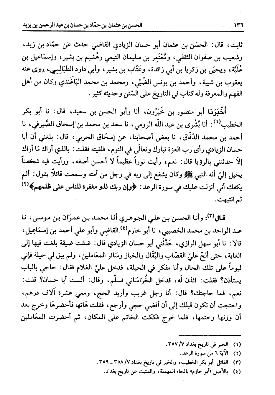 بن ثابت قال الحسن بن عثمان أبو حسان الزيادي القاضي حدث عن حماد بن زيد وشعيب بن صفوان الثقفي ومعتمر بن سليمان التيمي وهشيم بن بشير وإسماعيل بن علية ويحيى بن زكريا بن أبي زائدة وعتاب بن بشير وأبي داود الطيالسي روى عنه يعقوب بن شيبة وأحمد بن يونس الضبي ومحمد بن محمد الباغندي وكان من أهل الفهم والمعرفة وله كتاب في التاريخ على السنن وحديثه كثير أخبرنا أبو منصور بن خيرون أنا وأبو الحسن بن سعيد قال نا أبو بكر الخطيب (1) : أنا بشرى بن عبد الله الرومي نا سعد بن محمد بن إسحاق الصيرفي نا أحمد بن محمد الدقاق نا بعض أصحابنا عن إسحاق الحربي قال بلغني أن أبا حسان الزيادي رأى رب العزة تبارك وتعالى في النوم فلقيته فقلت بالذي أراك ما أراك إلا حدثتني بالرؤيا قال نعم رأيت نورا عظيما لا أحسن أصفه ورأيت فيه شخصا يخيل إلي أنه النبي (صلى الله عليه وسلم) وكان يشفع إلى ربه في رجل من أمته وسمعت قائلا يقول ألم يكفك أني أنزلت عليك في سورة الرعد " وإن ربك لذو مغفرة للناس على ظلمهم (2) " ثم انتبهت قال (3) : وأنا الحسن بن علي الجوهري أنا محمد بن عمران بن موسى نا عبد الواحد بن محمد الخصيبي نا أبو خازم (4) القاضي وأبو علي أحمد بن إسماعيل قالا نا أبو سهل الرازي حدثني أبو حسان الزيادي قال ضقت ضيقة بلغت فيها إلى الغاية حتى ألح علي القصاب والبقال والخباز وسائر المعاملين ولم يبق لي حيلة فإني ليوما على تلك الحال وأنا مفكر في الحيلة فدخل علي الغلام فقال حاجي بالباب يستأذن فقلت ائذن له فدخل الخراساني فسلم وقال ألست أبا حسان قلت نعم فما حاجتك قال أنا رجل غريب وأريد الحج ومعي عشرة آلاف درهم واحتجت أن تكون قبلك إلى أن أقضي حجي وأرجع فقلت هاتها فأحضرها وخرج بعد أن وزنها وختمها فلما خرج فككت الخاتم على المكان ثم أحضرت المعاملين