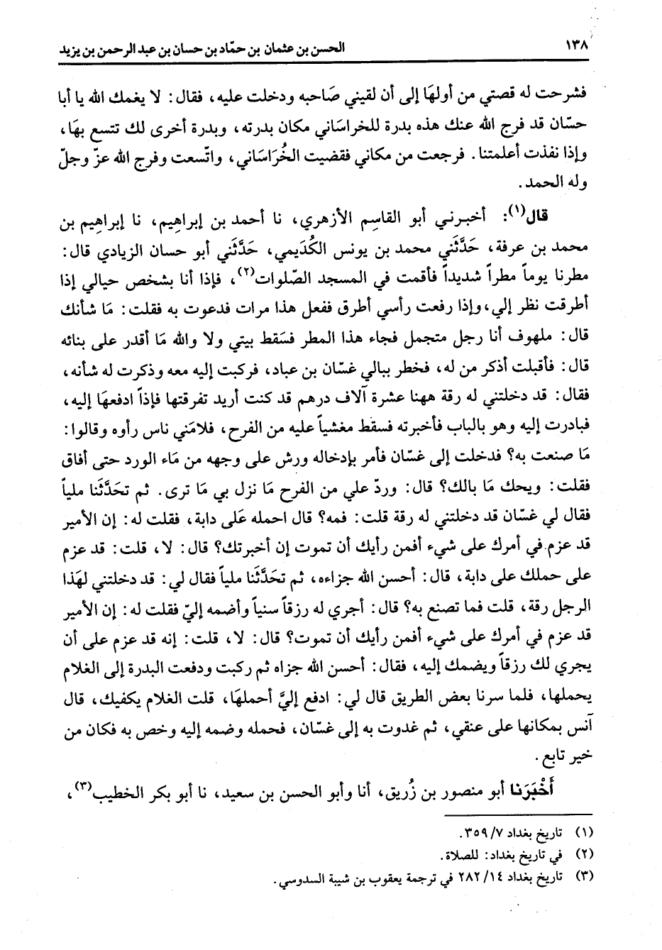 فشرحت له قصتي من أولها إلى أن لقيني صاحبه ودخلت عليه فقال لا يغمك الله يا أبا حسان قد فرج الله عنك هذه بدرة للخراساني مكان بدرته وبدرة أخرى لك تتسع بها وإذا نفذت أعلمتنا فرجعت من مكاني فقضيت الخراساني واتسعت وفرج الله عز وجل وله الحمد قال (1) : أخبرني أبو القاسم الأزهري نا أحمد بن إبراهيم نا إبراهيم بن محمد بن عرفة حدثني محمد بن يونس الكديمي حدثني أبو حسان الزيادي قال مطرنا يوما مطرا شديدا فأقمت في المسجد الصلوات (2) فإذا أنا بشخص حيالي إذا أطرقت نظر إلي وإذا رفعت رأسي أطرق ففعل هذا مرات فدعوت به فقلت ما شأنك قال ملهوف أنا رجل متجمل فجاء هذا المطر فسقط بيتي ولا والله ما أقدر على بنائه قال فأقبلت أذكر من له فخطر ببالي غسان بن عباد فركبت إليه معه وذكرت له شأنه فقال قد دخلتني له رقة ههنا عشرة آلاف درهم قد كنت أريد تفرقتها فإذا ادفعها إليه فبادرت إليه وهو بالباب فأخبرته فسقط مغشيا عليه من الفرح فلامني ناس رأوه وقالوا ما صنعت به فدخلت إلى غسان فأمر بإدخاله ورش على وجهه من ماء الورد حتى أفاق فقلت ويحك ما بالك قال ورد علي من الفرح ما نزل بي ما ترى ثم تحدثنا مليا فقال لي غسان قد دخلتني له رقة قلت فمه قال احمله على دابة فقلت له إن الأمير قد عزم في أمرك على شئ أفمن رأيك أن تموت إن أخبرتك قال لا قلت قد عزم على حملك على دابة قال أحسن الله جزاءه ثم تحدثنا مليا فقال لي قد دخلتني لهذا الرجل رقة قلت فما تصنع به قال أجري له رزقا سنيا وأضمه إلي فقلت له إن الأمير قد عزم في أمرك على شئ أفمن رأيك أن تموت قال لا قلت إنه قد عزم على أن يجري لك رزقا ويضمك إليه فقال أحسن الله جزاه ثم ركبت ودفعت البدرة إلى الغلام يحملها فلما سرنا بعض الطريق قال لي ادفع إلي أحملها قلت الغلام يكفيك قال آنس بمكانها على عنقي ثم غدوت به إلى غسان فحمله وضمه إليه وخص به فكان من خير تابع أخبرنا أبو منصور بن زريق أنا أبو الحسن بن سعيد نا أبو بكر الخطيب (3)