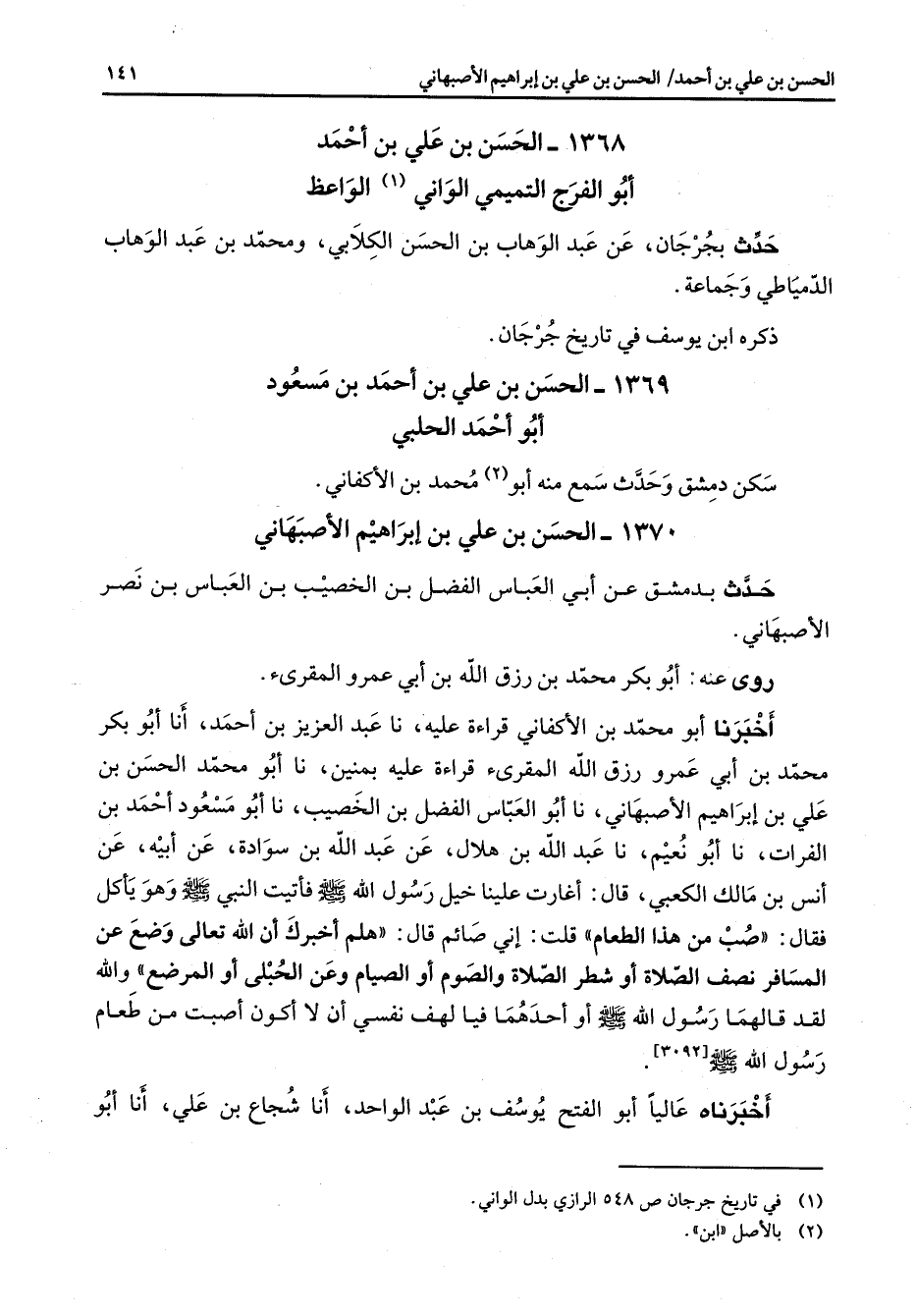 1370 - الحسن بن علي بن إبراهيم الأصبهاني حدث بدمشق عن أبي العباس الفضل بن الخصيب بن العباس بن نصر الأصبهاني روى عنه أبو بكر محمد بن رزق الله بن أبي عمرو المقرئ أخبرنا أبو محمد بن الأكفاني قراءة عليه نا عبد العزيز بن أحمد أنا أبو بكر محمد بن أبي عمرو رزق الله المقرئ قراءة عليه بمنين نا أبو أحمد الحسن بن علي بن إبراهيم الأصبهاني نا أبو العباس الفضل بن الخصيب نا أبو مسعود أحمد بن الفرات نا أبو نعيم نا عبد الله بن هلال عن عبد الله بن سوادة عن أبيه عن أنس بن مالك الكعبي قال أغارت علينا خيل رسول الله (صلى الله عليه وسلم) فأتيت النبي (صلى الله عليه وسلم) وهو يأكل فقال صب من هذا الطعام قلت إني صائم قال هلم أخبرك أن الله تعالى وضع عن المسافر نصف الصلاة أو شطر الصلاة والصوم أو الصيام وعن الحبلى أو المرضع والله لقد قالهما رسول الله (صلى الله عليه وسلم) أو أحدهما فيا لهف نفسي أن لا أكون أصبت من طعام رسول الله (صلى الله عليه وسلم) أخبرناه عاليا أبو الفتح يوسف بن عبد الواحد أنا شجاع بن علي أنا أبو