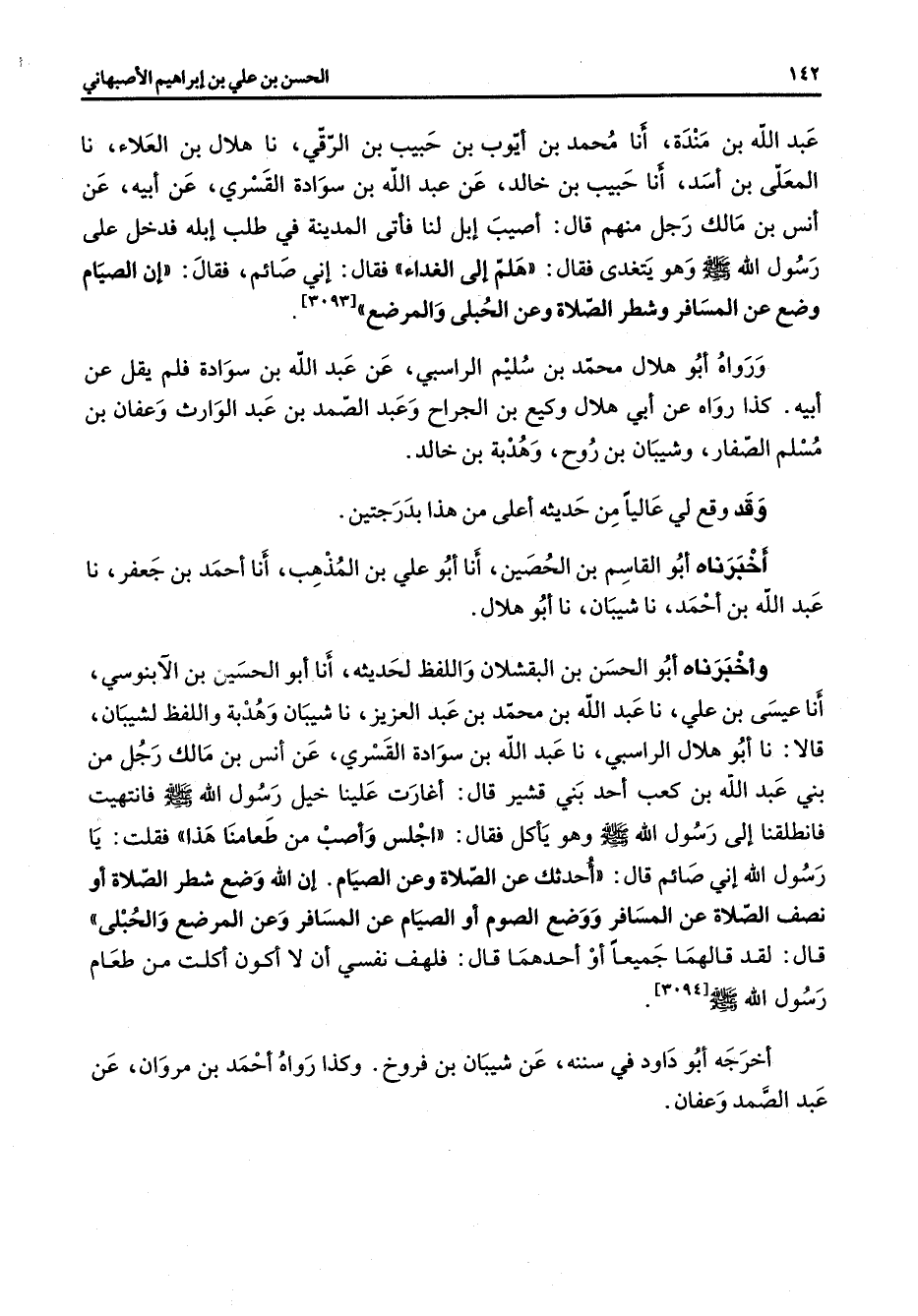 عبد الله بن مندة أنا محمد بن أيوب بن حبيب بن الرقي نا هلال بن العلاء نا المعلى بن أسد أنا حبيب بن خالد عن عبد الله بن سوادة القسري عن أبيه عن أنس بن مالك رجل منهم قال أصيب إبل فأتى المدينة في طلب إبله فدخل على رسول الله (صلى الله عليه وسلم) وهو يتغدى فقال هلم إلى الغداء فقال إني صائم فقال إن الصيام وضع عن المسافر وشطر الصلاة وعن الحبلى والمرضع ورواه أبو هلال محمد بن سليم الراسبي عن عبد الله بن سوادة فلم يقل عن أبيه كذا رواه عن أبي هلال وكيع بن الجراح وعبد الصمد بن عبد الوارث وعفان بن مسلم الصفار وشيبان بن روح وهدبة بن خالد وقد وقع لي عاليا من حديثه أعلى من هذا بدرجتين أخبرناه أبو القاسم بن الحصين أنا أبو علي بن المذهب أنا أحمد بن جعفر نا عبد الله بن أحمد نا شيبان نا أبو هلال وأخبرناه أبو الحسن بن البقشلان واللفظ لحديثه أنا أبو الحسين بن الآبنوسي أنا عيسى بن علي نا عبد الله بن محمد بن عبد العزيز نا شيبان وهدبة واللفظ لشيبان قالا نا أبو هلال الراسبي نا عبد الله بن سوادة القسري عن أنس بن مالك رجل من بني عبد الله بن كعب أحد بني قشير قال أغارت علينا خيل رسول الله (صلى الله عليه وسلم) فانتهيت فانطلقنا إلى رسول الله (صلى الله عليه وسلم) وهو يأكل فقال اجلس وأصب من طعامنا هذا فقلت يا رسول الله إني صائم قال أحدثك عن الصلاة وعن الصيام إن الله وضع شطر الصلاة أو نصف الصلاة عن المسافر ووضع الصوم أو الصيام عن المسافر وعن المرضع والحبلى قال لقد قالهما جميعا أو أحدهما قال فلهف نفسي أن لا أكون أكلت من طعام رسول الله (صلى الله عليه وسلم) أخرجه أبو داود في سننه عن شيبان بن فروخ وكذا رواه أحمد بن مروان عن عبد الصمد وعفان