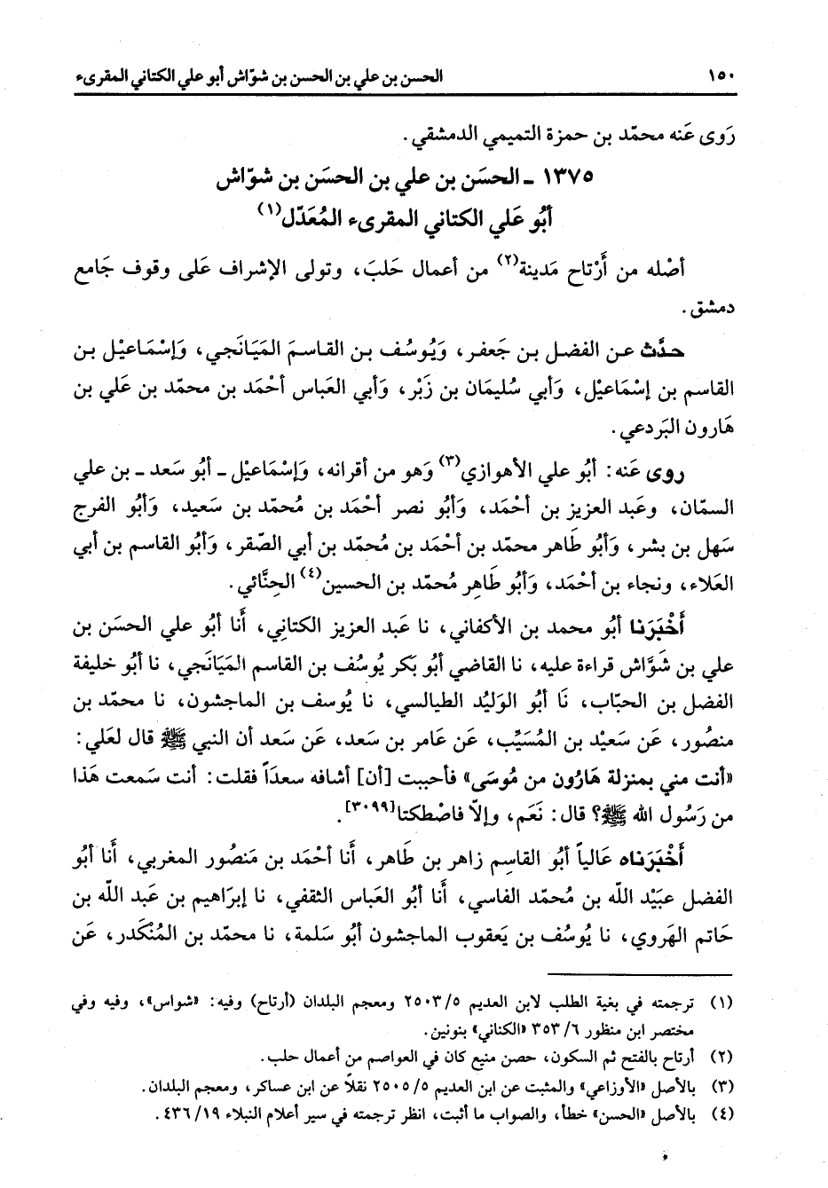 روى عنه محمد بن حمزة التميمي الدمشقي 1375 الحسن بن علي بن الحسن بن شواش أبو علي الكتاني المقرئ المعدل (1) أصله من أرتاح مدينة (2) من أعمال حلب وتولى الإشراف على وقوف جامع دمشق حدث عن الفضل بن جعفر ويوسف بن القاسم الميانجي وإسماعيل بن القاسم بن إسماعيل وأبي سليمان بن زبر وأبي العباس أحمد بن محمد بن علي بن هارون البردعي روى عنه أبو علي الأهوازي (3) وهو من أقرانه وإسماعيل أبو سعد بن علي السمان وعبد العزيز بن أحمد وأبو نصر أحمد بن محمد بن سعيد وأبو الفرج سهل بن بشر وأبو طاهر محمد بن أحمد بن محمد بن أبي الصقر وأبو القاسم بن أبي العلاء ونجاء بن أحمد وأبو طاهر محمد بن الحسين (4) الحنائي أخبرنا أبو محمد بن الأكفاني نا عبد العزيز الكتاني أنا أبو علي الحسن بن علي بن شواش قراءة عليه نا القاضي أبو بكر يوسف بن القاسم الميانجي نا أبو ح خليفة الفضل بن الحباب نا أبو الوليد الطيالسي نا يوسف بن الماجشون نا محمد بن منصور عن سعيد بن المسيب عن عامر بن سعد عن سعد أن النبي (صلى الله عليه وسلم) قال لعلي أنت مني بمنزلة هارون من موسى فأحببت أن أشافه سعدا فقلت أنت سمعت هذا من رسول الله (صلى الله عليه وسلم) قال نعم وإلا فاصطكتا أخبرناه عاليا أبو القاسم زاهر بن طاهر أنا أحمد بن منصور المغربي أنا أبو الفضل عبيد الله بن محمد الفاسي أنا أبو العباس الثقفي نا إبراهيم بن عبد الله بن حاتم الهروي نا يوسف بن يعقوب الماجشون أبو سلمة نا محمد بن المنكدر عن