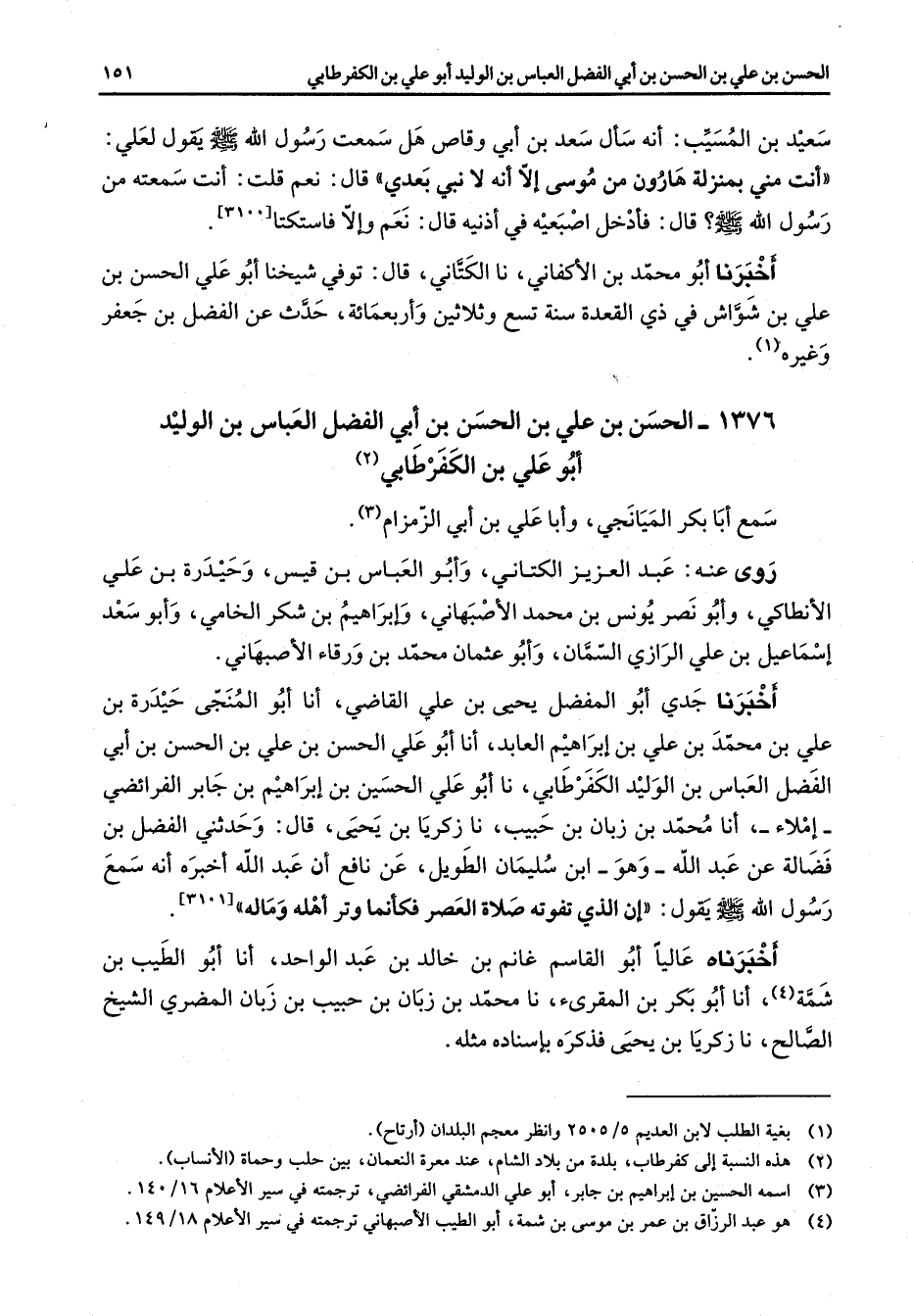 1376 - الحسن بن علي بن الحسن بن أبي الفضل العباس بن الوليد أبو علي بن الكفرطابي (2) سمع أبا بكر الميانجي وأبا علي بن أبي الزمزام (3) روى عنه عبد العزيز الكتاني وأبو العباس بن قيس وحيدرة بن علي الأنطاكي وأبو نصر يونس بن محمد الأصبهاني وإبراهيم بن شكر الخامي وأبو سعد إسماعيل بن علي الرازي السمان وأبو عثمان محمد بن ورقاء الأصبهاني أخبرنا جدي أبو المفضل يحيى بن علي القاضي أنا أبو المنجي حيدرة بن علي بن محمد بن علي بن إبراهيم العابد أنا أبو علي الحسن بن علي بن الحسن بن أبي الفضل العباس بن الوليد الكفرطابي نا أبو علي الحسين بن إبراهيم بن جابر الفرائضي إملاء أنا محمد بن زبان بن حبيب نا زكريا بن يحيى قال وحدثني الفضل بن فضالة عن عبد الله وهو ابن سليمان الطويل عن نافع أن عبد الله أخبره أنه سمع رسول الله (صلى الله عليه وسلم) يقول إن الذي تفوته صلاة العصر فكأنما وتر أهله وماله أخبرناه عاليا أبو القاسم غانم بن خالد بن عبد الواحد أنا أبو الطيب بن شمة (4) أنا أبو بكر بن المقرئ نا محمد بن زبان بن حبيب بن زبان المضري الشيخ الصالح نا زكريا بن يحيى فذكره بإسناده مثله