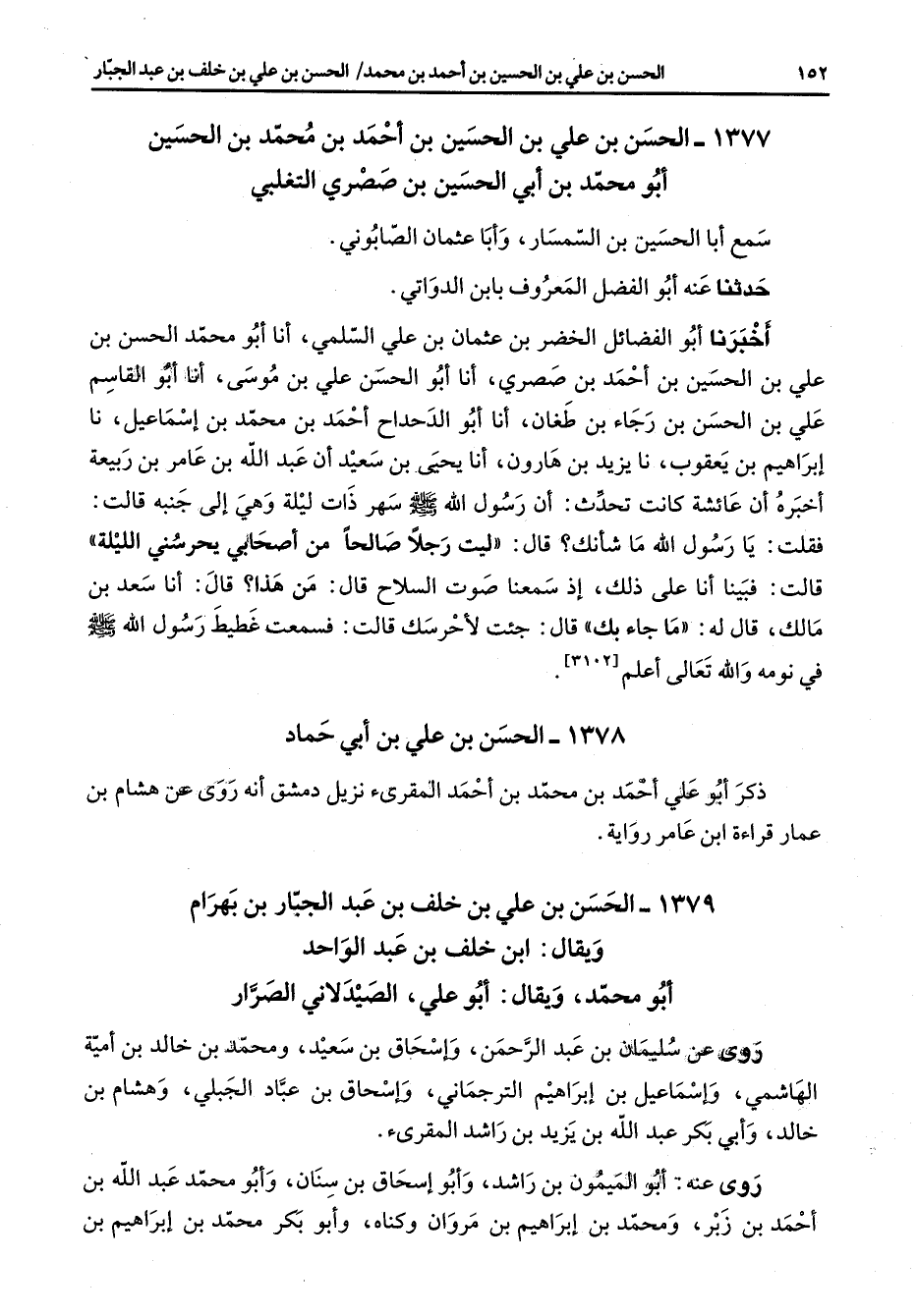 1377 - الحسن بن علي بن الحسين بن أحمد بن محمد بن الحسين أبو محمد بن أبي الحسين بن صصري التغلبي سمع أبا الحسين بن السمسار وأبا عثمان الصابوني حدثنا عنه أبو الفضل المعروف بابن الدواتي أخبرنا أبو الفضائل الخضر بن عثمان بن علي السلمي أنا أبو محمد الحسن بن علي بن الحسين بن أحمد بن صصري أنا أبو الحسن علي بن موسى أنا أبو القاسم علي بن الحسن بن رجاء بن طغان أنا أبو الدحداح أحمد بن محمد بن إسماعيل نا إبراهيم بن يعقوب نا يزيد بن هارون أنا يحيى بن سعيد أن عبد الله بن عامر بن ربيعة أخبره أن عائشة كانت تحدث أن رسول الله (صلى الله عليه وسلم) سهر ذات ليلة وهي إلى جنبه قالت فقلت يا رسول الله ما شأنك قال ليت رجلا صالحا من أصحابي يحرسني الليلة قالت فبينا أنا على ذلك إذ سمعنا صوت السلاح قال من هذا قال أنا سعد بن مالك قال له ما جاء بك قال جئت لأحرسك قالت فسمعت غطيط رسول الله (صلى الله عليه وسلم) في نومه والله تعالى أعلم