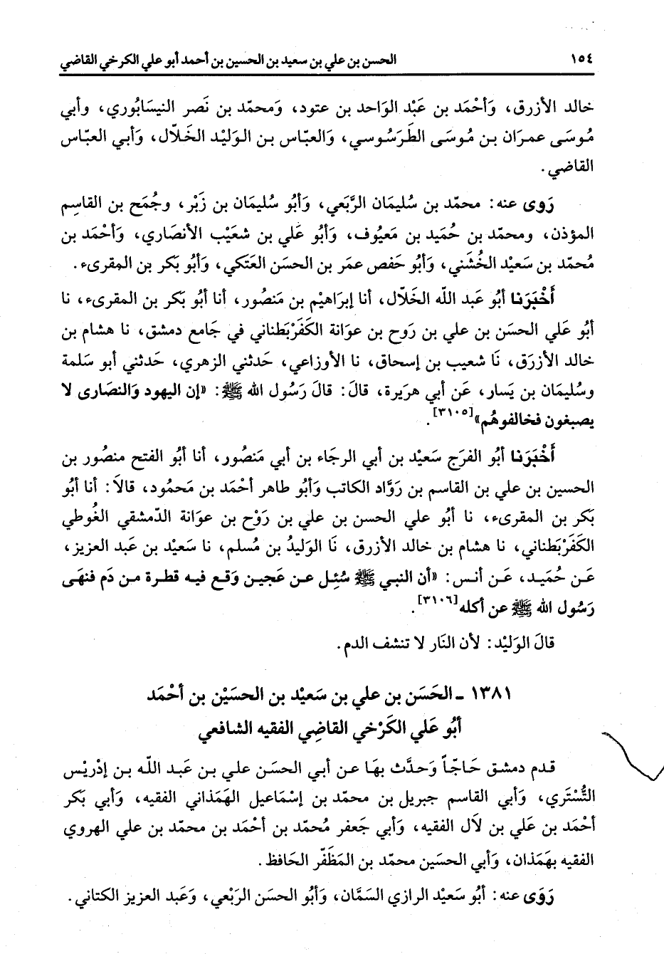 خالد الأزرق وأحمد بن عبد الواحد بن عتود ومحمد بن نصر النيسابوري وأبي موسى عمران بن موسى الطرسوسي والعباس بن الوليد الخلال وأبي العباس القاضي روى عنه محمد بن سليمان الربعي وأبو سليمان بن زبر وجمح بن القاسم المؤذن ومحمد بن حميد بن معيوف وأبو علي بن شعيب الأنصاري وأحمد بن محمد بن سعيد الخشني وأبو حفص عمر بن الحسن العتكي وأبو بكر بن المقرئ أخبرنا أبو عبد الله الخلال أنا إبراهيم بن منصور أنا أبو بكر بن المقرئ نا أبو علي الحسن بن علي بن روح بن عوانة الكفربطناني في جامع دمشق نا هشام بن خالد الأزرق نا شعيب بن إسحاق نا الأوزاعي حدثني الزهري حدثني أبو سلمة وسليمان بن يسار عن أبي هريرة قال قال رسول الله (صلى الله عليه وسلم) إن اليهود والنصارى لا يصبغون فخالفوهم أخبرنا أبو الفرج سعيد بن أبي الرجاء بن أبي منصور أنا أبو الفتح منصور بن الحسين بن علي بن القاسم بن رواد الكاتب وأبو طاهر أحمد بن محمود قالا أنا أبو بكر بن المقرئ نا أبو علي الحسن بن علي بن روح بن عوانة الدمشقي الغوطي الكفربطناني نا هشام بن خالد الأزرق نا الوليد بن مسلم نا سعيد بن عبد العزيز عن حميد عن أنس أن النبي (صلى الله عليه وسلم) سئل عن عجين وقع فيه قطرة من دم فنهى رسول الله (صلى الله عليه وسلم) عن أكله قال الوليد لأن النار لا تنشف الدم 1381 - الحسن بن علي بن سعيد بن الحسين بن أحمد أبو علي الكرخي القاضي الفقيه الشافعي قدم دمشق حاجا وحدث بها عن أبي الحسن علي بن عبد الله بن إدريس التستري وأبي القاسم جبريل بن محمد بن إسماعيل الهمذاني الفقيه وأبي بكر أحمد بن علي بن لال الفقيه وأبي جعفر محمد بن أحمد بن محمد بن علي الهروي الفقيه بهمذان وأبي الحسن محمد بن المظفر الحافظ روى عنه أبو سعيد الرازي السمان وأبو الحسن الربعي وعبد العزيز الكتاني