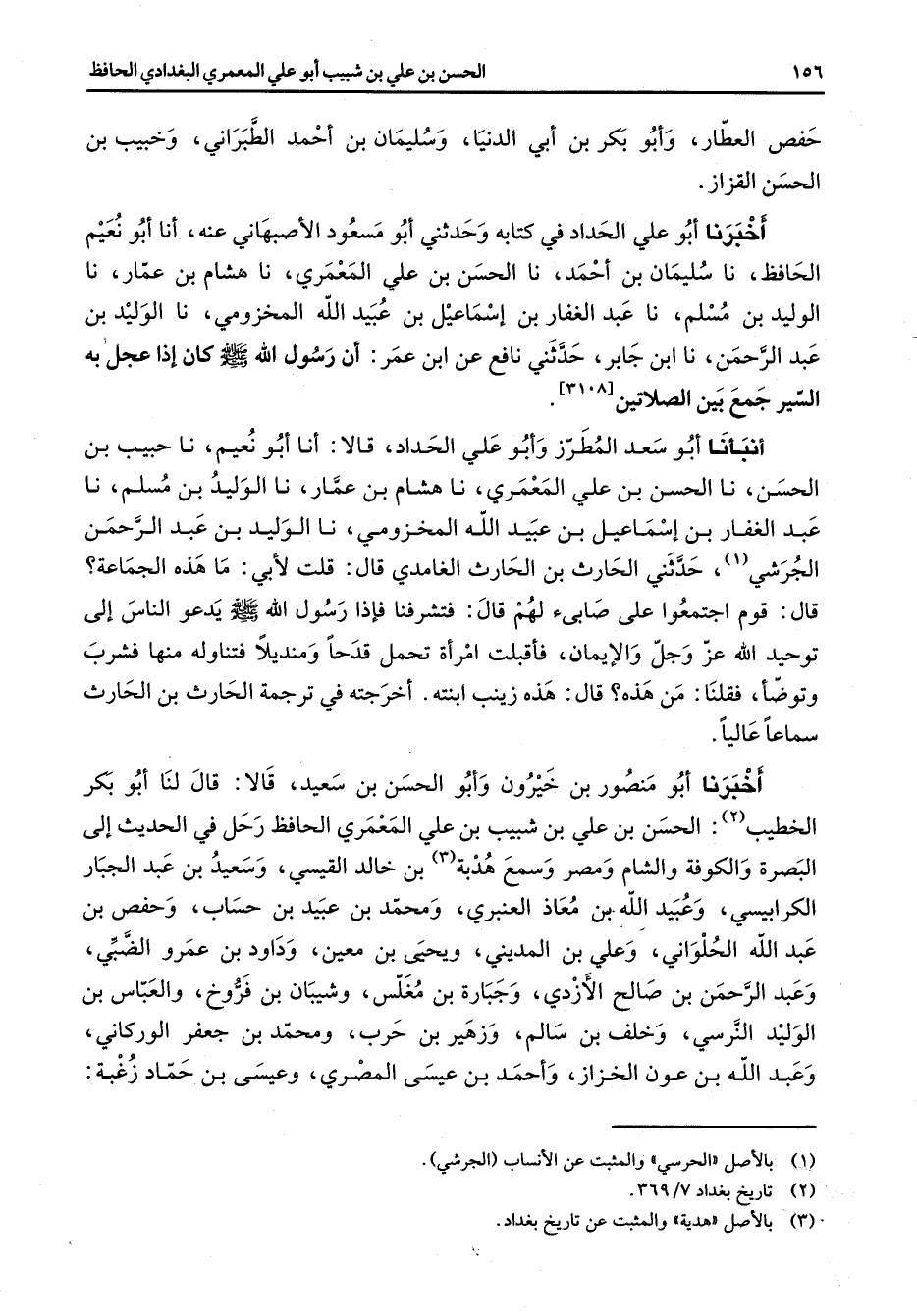 حفص العطار وأبو بكر بن أبي الدنيا وسليمان بن أحمد الطبراني وخبيب بن الحسن القزاز أخبرنا أبو علي الحداد في كتابه وحدثني أبو مسعود الأصبهاني عنه أنا أبو نعيم الحافظ نا سليمان بن أحمد نا الحسن بن علي المعمري نا هشام بن عمار نا الوليد بن مسلم نا عبد الغفار بن إسماعيل بن عبيد الله المخزومي نا الوليد بن عبد الرحمن نا ابن جابر حدثني نافع عن ابن عمر أن رسول الله (صلى الله عليه وسلم) كان إذا عجل به السير جمع بين الصلاتين أنبأنا أبو سعد المطرز وأبو علي الحداد قالا أنا أبو نعيم نا حبيب بن الحسن نا الحسن بن علي المعمري نا هشام بن عمار نا الوليد بن مسلم نا عبد الغفار بن إسماعيل بن عبيد الله المخزومي نا الوليد بن عبد الرحمن الجرشي (1) حدثني الحارث بن الحارث الغامدي قال قلت لأبي ما هذه الجماعة قال قوم اجتمعوا على صابئ لهم قال فتشرفنا فإذا رسول الله (صلى الله عليه وسلم) يدعو الناس إلى توحيد الله عز وجل والإيمان فأقبلت امرأة تحمل قدحا ومنديلا فتناوله منها فشرب وتوضأ فقلنا من هذه قال هذه زينب ابنته أخرجته في ترجمة الحارث بن الحارث سماعا عاليا أخبرنا أبو منصور بن خيرون وأبو الحسن بن سعيد قالا قال لنا أبو بكر الخطيب (2) : الحسن بن علي بن شبيب بن علي المعمري الحافظ رحل في الحديث إلى البصرة والكوفة والشام ومصر وسمع هدبة (3) بن خالد القيسي وسعيد بن عبد الجبار الكرابيسي وعبيد الله بن معاذ العنبري ومحمد بن عبيد بن حساب وحفص بن عبد الله الحلواني وعلي بن المديني ويحيى بن معين وداود بن عمرو الضبي وعبد الرحمن بن صالح الأزدي وجبارة بن مغلس وشيبان بن فروخ والعباس بن الوليد النرسي وخلف بن سالم وزهير بن حرب ومحمد بن جعفر الوركاني وعبد الله بن عون الخزاز وأحمد بن عيسى المصري وعيسى بن حماد زغبة