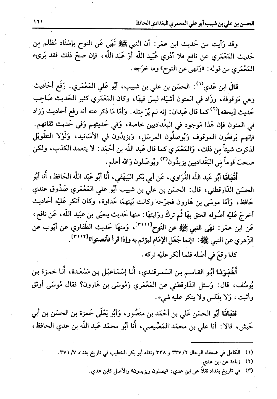 وقد رأيت من حديث ابن عمر أن النبي (صلى الله عليه وسلم) نهى عن النوح بإسناد مظلم من حديث المعمري عن نافع فلا ادري عبيد الله أو عبد الله فإن صح ذلك فقد برئ المعمري من قوله ونهى عن النوح وما خرجه قال ابن عدي (1) الحسن بن علي بن شبيب أبو علي المعمري رفع أحاديث وهي موقوفة وزاد في المتون أشياء ليس فيها وكان المعمري كثير الحديث صاحب حديث بحقه (2) كما قال عبدان انه لم ير مثله واما ما ذكر عنه انه رفع أحاديث وزاد في المتون فإن هذا موجود في البغداديين خاصة وفي حديثهم وفي حديث ثقاتهم فإنهم يرفعون الموقوف ويوصلون المرسل ويزيدون في الاسانيد ولولا التطويل لذكرت شيئا من ذلك والمعمري كما قال عبد الله بن احمد لا يتعمد الكذب ولكن صحب قوما من البغداديين يزيدون (3) ويوصلون والله اعلم أنبأنا أبو عبد الله الفراوي عن أبي بكر البيهقي أنا أبو عبد الله الحافظ أنا أبو الحسن الدارقطني قال الحسن بن علي بن شبيب أبو علي المعمري صدوق عندي حافظ واما موسى بن هارون فجرحه وكانت بينهما عداوة وكان انكر عليه أحاديث اخرج عليه اصوله العتق بها ثم ترك روايتها منها حديث يحيى بن عبيد الله عن نافع عن ابن عمر نهى النبي (صلى الله عليه وسلم) عن النوح ومنها حديث الطفاوي عن ايوب عن الزهري عن النبي (صلى الله عليه وسلم) إنما جعل الأمام ليؤتم به وإذا قرأ فأنصتوا كذا وقع في اصله ح ح فلما انكر عليه تركه اخبرنا أبو القاسم بن السمرقندي أنا إسماعيل بن مسعدة أنا حمزة بن يوسف قال وسئل الدارقطني عن المعمري وموسى بن هارون فقال موسى اوثق واثبت ولا يدلس ولا ينكر عليه شئ أنبأنا أبو الحسن علي بن احمد بن منصور وأبو يعلي حمزة بن الحسن بن أبي حبش قالا أنا علي بن محمد المصيصي أنا أبو محمد عبد الله بن عدي الحافظ