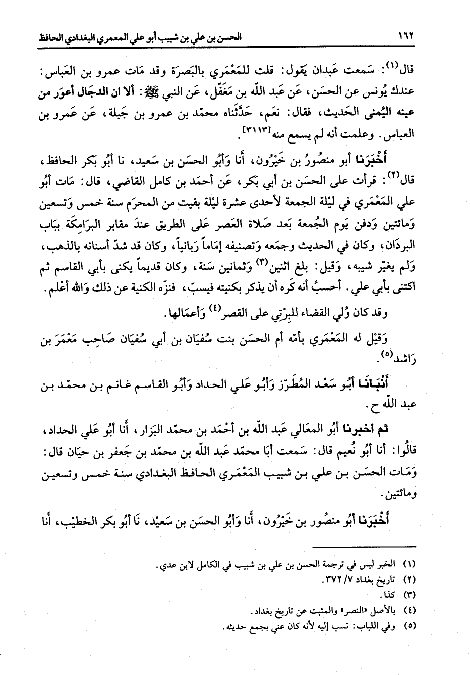 أنبأنا أبو سعد المطرز وأبو علي الحداد وأبو القاسم غانم بن محمد بن عبد الله ثم اخبرنا أبو المعالي عبد الله بن احمد بن محمد البزار أنا أبو علي الحداد قالوا أنا أبو نعيم قال سمعت أبا محمد عبد الله بن محمد بن جعفر بن حيان قال ومات الحسن بن علي بن شبيب المعمري الحافظ البغدادي سنة خمس وتسعين ومائتين اخبرنا أبو منصور بن خيرون أنا وأبو الحسن بن سعيد نا أبو بكر الخطيب أنا