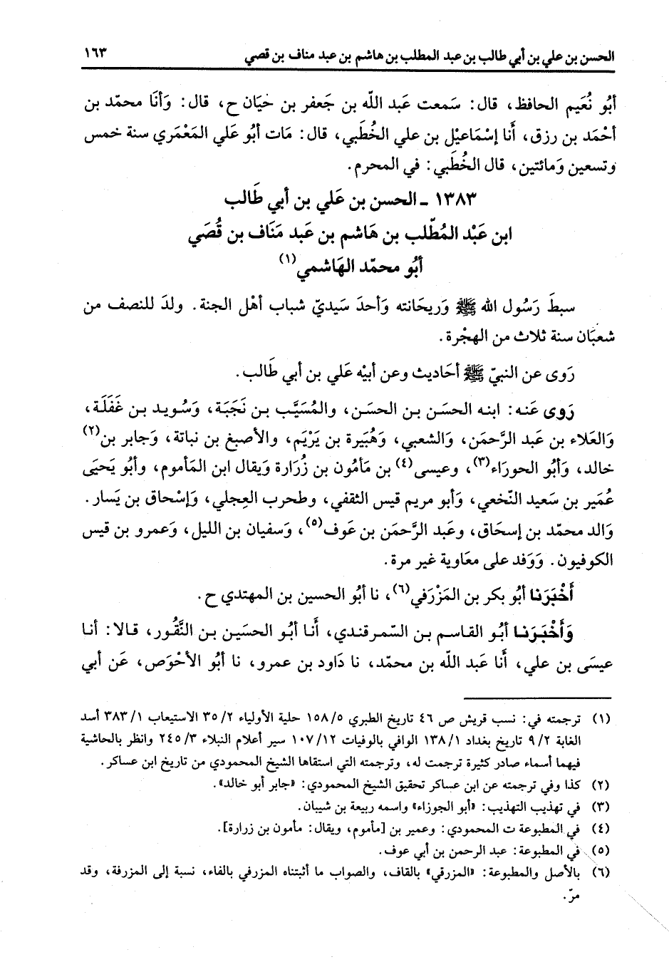 أبو نعيم الحافظ قال سمعت عبد الله بن جعفر بن حيان قال وأنا محمد بن احمد بن زرق أنا إسماعيل بن علي الخطبي قال مات أبو علي المعمري سنة خمس وتسعين ومائتين قال الخطبي في المحرم 1383 - الحسن بن علي بن أبي طالب ابن عبد المطلب بن هاشم بن عبد مناف بن قصي أبو محمد الهاشمي (1) سبط رسول الله (صلى الله عليه وسلم) وريحانته واحد سيدي شباب أهل الجنة ولد للنصف من شعبان سنة ثلاث من الهجرة روى عن النبي (صلى الله عليه وسلم) أحاديث وعن أبيه علي بن أبي طالب روى عنه ابنه الحسن بن الحسن والمسيب بن نجبة وسويد بن غفلة والعلاء بن عبد الرحمن والشعبي زهبيرة بن يريم والاصبغ بن نباتة وجابر بن (2) خالد وأبو الحوراء (3) وعيسى بن (4) مأمون بن زرارة ويقال ابن المأموم وأبو يحيى عمير بن سعيد النخعي وأبو مريم قيس الثقفي وطحرب العجلي وإسحاق بن يسار والد محمد بن إسحاق وعبد الرحمن بن عوف (5) وسفيان بن الليل وعمرو بن قيس الكوفيون ووفد على معاوية غير مرة اخبرنا أبو بكر بن المزرفي (6) نا أبو الحسين بن المهتدي واخبرنا أبو القاسم بن السمرقندي أنا أبو الحسين بن النقور قالا أنا عيسى بن علي أنا عبد الله بن محمد نا داود بن عمرو نا أبو الاحوص عن أبي