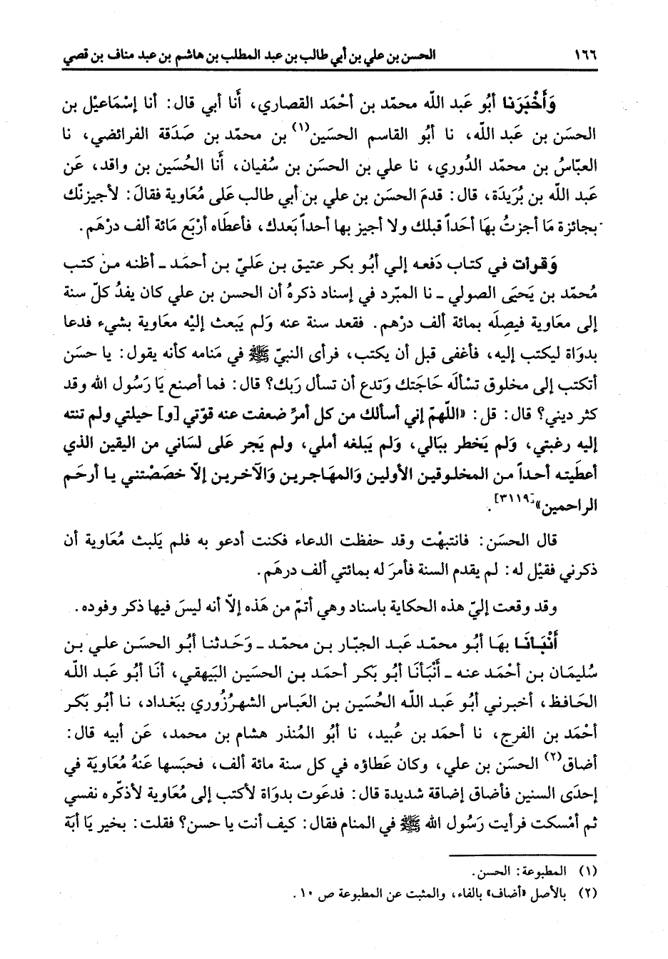 واخبرنا أبو عبد الله محمد بن احمد القصاري أنا أبي قال أنا إسماعيل بن الحسن بن عبد الله نا أبو القاسم الحسين (1) بن محمد بن صدقة الفرائضي نا العباس بن محمد الدوري الدوري نا علي بن الحسن بن سفيان أنا الحسين بن واقد عن عبد الله بن بريدة قال قدم الحسن بن علي بن أبي طالب على معاوية فقال لأجيزنك بجائزة ما اجزت بها أحدا قبلك ولا اجيز بها أحدا بعدك فأعطاه اربع مائة ألف درهم وقرأت في كتاب دفعه الي أبو بكر عتيق بن علي بن احمد اظنه من كتب محمد بن يحيى الصولي نا المبرد في اسناد ذكره أن الحسن بن علي كان يفد كل سنة إلى معاوية فيصلة بمائة ألف درهم فقعد سنة عنه ولم يبعث إليه معاوية بشئ فدعا بدواة ليكتب إليه فأغفى قبل أن يكتب فرأى النبي (صلى الله عليه وسلم) في منامه كأنه يقول يا حسن اتكتب إلي مخلوق تسأله حاجتك وتدع أن تسأل ربك قال فما اصنع يا رسول الله وقد كثر ديني قال قل اللهم أني أسألك من كل أمر ضعفت عنه قوتي وحيلتي ولم تنته إليه رغبتي ولم يخطر ببالي ولم يبلغه املي ولم يجر على لساني من اليقين الذي اعطيته أحدا من المخلوقين الأولين والمهاجرين والآخرين إلا خصصتني يا ارحم الراحمين قال الحسن فانتبهت وقد حفظت الدعاء فكنت ادعو به فلم يلبث معاوية أن ذكرني فقيل له لم يقدم السنة فأمر له بمائتي ألف درهم وقد وقعت الي هذه الحكاية باسناد وهي اتم من هذه إلا انه ليس فيها ذكر وفوده أنبأنا بها أبو محمد عبد الجبار بن محمد وحدثنا أبو السحن علي بن سليمان بن احمد عنه أنبأنا أبو بكر احمد بن الحسين البهيقي أنا أبو عبد الله الحافظ اخبرني أبو عبد الله الحسين بن العباس الشهرزوري ببغداد نا أبو بكر احمد بن الفرج نا احمد بن عبيد نا أبو المنذر هشام بن محمد عن أبيه قال: اضاق (2) الحسن بن علي وكان عطاؤه في كل سنة مائة ألف فحبسها عنه معاوية في إحدى السنين فأضاق إضاقة شديدة قال فدعوت بدواة لاكتب إلى معاوية لاذكره نفسي ثم امسكت فرأيت رسول الله (صلى الله عليه وسلم) في المنام فقال كيف أنت يا حسن فقلت بخير يا ابة