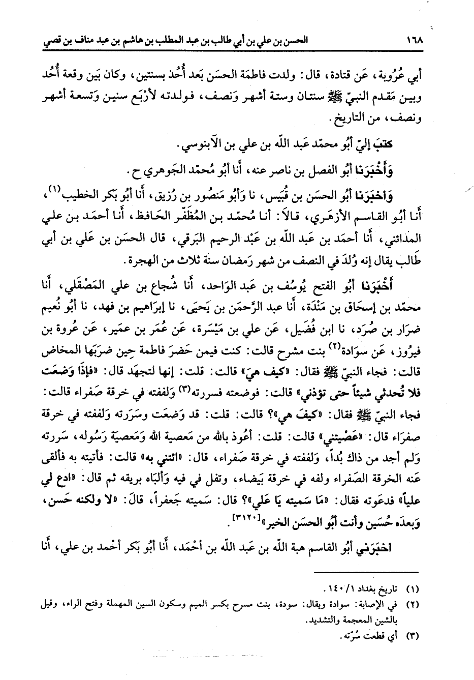 أبي عروبة عن قتادة قال ولدت فاطمة الحسن بعد أحد بسنتين وكان بين وقعة أحد وبين مقدم النبي (صلى الله عليه وسلم) سنتان وستة اشهر ونصف فولدته لاربع سنين وتسعة اشهر ونصف من التاريخ كتب الي أبو محمد عبد الله بن علي بن الابنوسي واخبرنا أبو الفضل بن ناصر عنه أنا أبو محمد الجوهري واخبرنا أبو الحسن بن قبيس نا وأبو منصور بن رزيق أنا أبو بكر الخطيب (1) أنا أبو القاسم الازهري قالا أنا محمد بن المظفر الحافظ أنا احمد بن علي المدائني أنا احمد بن عبد الله بن عبد الرحيم البرقي قال الحسن بن علي بن أبي طالب يقال انه ولد في النصف من شهر رمضان سنة ثلاث من الهجرة اخبرنا أبو الفتح يوسف بن عبد الواحد أنا شجاع بن علي المصقلي أنا محمد بن إسحاق بن مندة أنا عبد الرحمن بن يحيى نا إبراهيم بن فهد نا أبو نعيم ضرار بن صرد نا ابن فضيل عن علي بن ميسرة عن عمر بن عمير عن عروة بن فيروز عن سوادة (2) بنت مشرح قالت كنت فيمن حضر فاطمة حين ضربها المخاض قالت فجاء النبي (صلى الله عليه وسلم) فقال كيف هي قالت قلت إنها لتجهد قال فإذا وضعت فلا تحدثي شيئا حتى تؤذني قالت فوضعته فسررته (3) ولفقته في خرقه صفراء قالت فجاء النبي (صلى الله عليه وسلم) فقال كيف هي قالت قلت قد وضعت وسررته ولفقته في خرقة صفراء قال عصيتني قالت قلت اعوذ بالله من معصية الله ومعصية رسوله سررته ولم اجد من ذاك بدا ولفقته في خرقة صفراء قال ائتني به قالت فأتيته به فألقى عنه الخرقة الصفراء ولفه في خرقة بيضاء وتفل في فيه والباه بريقه ثم قال ادع لي عليا فدعوته فقال ما سميته يا علي قال سميته جعفرا قال لا ولكنه حسن وبعده حسين وأنت أبو الحسن الخير اخبرني أبو القاسم هبة الله بن عبد الله بن احمد أنا أبو بكر احمد بن علي أنا