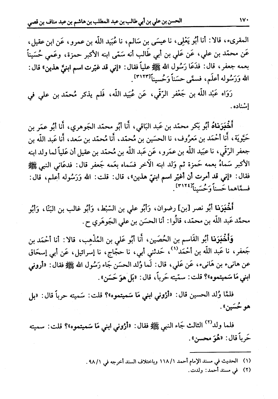 المقرئ قالا أنا أبو يعلي نا عيسى بن سالم نا عبيد الله بن عمرو عن ابن عقيل عن محمد بن علي عن علي بن أبي طالب انه سمى ابنه الاكبر حمزة وعمي حسينا بعمه جعفر قال فدعا رسول الله (صلى الله عليه وسلم) عليا فقال أني قد غيرت اسم ابني هذين قال الله ورسوله اعلم فسمى حسنا وحسينا رواه عبد الله بن جعفر الرقي عن عبيد الله فلم يذكر محمد بن علي اسناده أخبرناه أبو بكر محمد بن عبد الباقي أنا أبو محمد الجوهري أنا أبو عمر بن حيوية أنا احمد بن معروف نا الحسين بن محمد أنا محمد بن سعد أنا عبد الله بن جعفر الرقي نا عبيد الله بن عمرو عن عبد الله بن محمد بن عقيل أن عليا لما ولد ابنه الاكبر سماه بعمه حمزة ثم ولد ابنه الآخر فسماه بعمه جعفر قال فدعاني النبي (صلى الله عليه وسلم) فقال أني قد امرت أن اغير اسم ابني هذين قال قلت الله ورسوله أعلم قال فسماهما حسنا وحسينا اخبرنا أبو نصر بن رضوان وأبو علي بن السبط وأبو غالب بن البنا وأبو محمد عبد الله بن محمد قالوا أنا الحسن بن علي الجوهري واخبرنا أبو القاسم بن الحصين أنا أبو علي بن المذهب قالا أنا احمد بن جعفر نا عبد الله بن احمد (1) حدثني أبي نا حجاج نا إسرائيل عن أبي إسحاق عن هانئ بن هانئ عن علي قال لما ولد الحسن جاء رسول الله (صلى الله عليه وسلم) فقال اروني ابني ما سميتموه قلت سميته حربا قال بل هو حسن فلما ولد الحسين قال اروني ابني ما سميتموه قلت سميته حربا قال بل هو حسين فلما ولد (2) الثالث جاء النبي (صلى الله عليه وسلم) فقال اروني ابني ما سميتموه قلت سميته حربا قال هو محسن