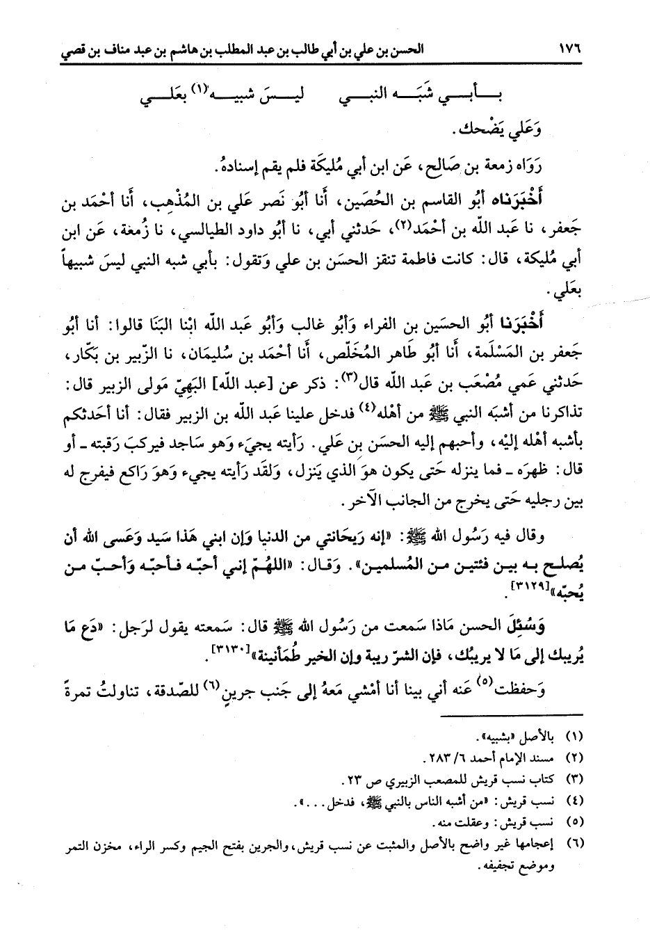 * بأبي شبه النبي * ليس شبيه (1) بعلي * وعلي يضحك رواه معه بن صالح عن ابن أبي مليكة فلم يقم اسناده أخبرناه أبو القاسم بن الحصين أنا أبو نصر علي بن المذهب أنا احمد بن جعفر نا عبد الله بن احمد (2) حدثني أبي نا أبو داود الطيالسي نا زمعة عن ابن أبي مليكة قال كنت فاطمة تنقز ر الحسن بن علي وتقول بأبي شبه النبي ليس شبيها بعلي اخبرنا أبو الحسين بن الفراء وأبو غالب وأبو عبد الله ابنا البنا قالوا أنا أبو جعفر بن المسلمة أنا أبو طاهر المخلص أنا احمد بن سليمان نا الزبير بن بكار حدثني عمي مصعب بن عبد الله قال (3) : ذكر عن عبد الله البهي مولى الزبير قال تذاكرنا من اشبه النبي (صلى الله عليه وسلم) من أهله (4) فدخل علينا عبد الله بن الزبير فقال أنا احدثكم بأشبه أهله إليه واحبهم إليه الحسن بن علي رأيته يجئ وهو ساجد فيركب رقبته أو قال ظهره فما ينزله حتى يكون هو الذي ينزل ولقد رأيته يجئ وهو راكع فيفرج له بين رجليه حتى يخرج من الجانب الآخر وقال فيه الرسول الله (صلى الله عليه وسلم) انه ريحانتي من الدنيا وان ابني هذا سيد وعسى الله أن يصلح به بين فئتين من المسلمين وقال اللهم أني احبه فأحبه واحب من يحبه وسئل الحسن ماذا سمعت من رسول الله (صلى الله عليه وسلم) قال سمعته يقول لرجل دع ما يريبك إلى ما لا يريبك فان الشرر ريبة وان الخير طمأنينة وحفظت (5) عنه أني بينا أنا امشي معه إلى جنب جرين (6) للصدقة تناولت تمرة