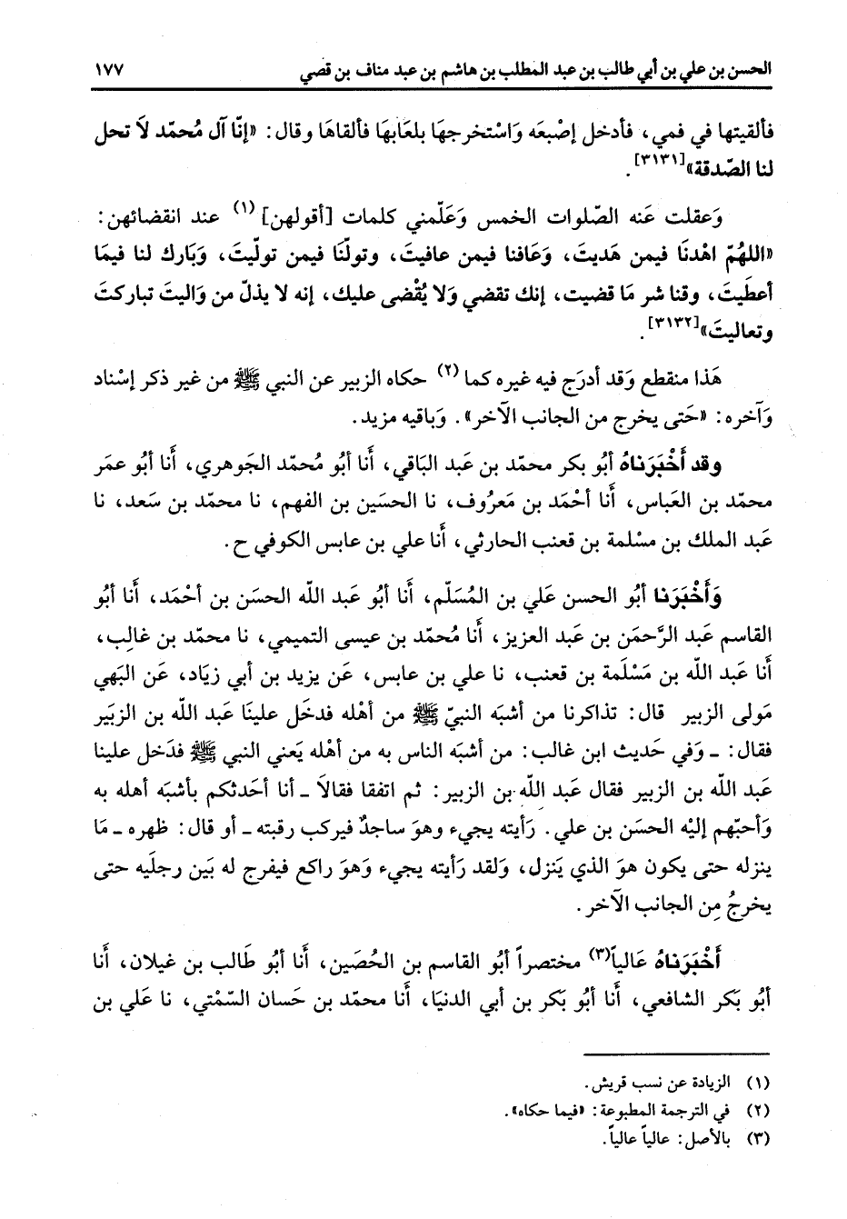 فألقيتها في فمي فأدخل اصبعه واستخرجها بلعابها فألقاها وقال إنا آل محمد لا تحل لنا الصدقة وعلقت عنه الصلوات الخمس وعلمني كلمات اقولهن (1) عند انقضائهن اللهم اهدنا فيمن هديت وعافنا فيمن عافيت وتولنا فيمن توليت وبارك لنا فيما اعطيت وقنا شر ما قضيت إنك تقضي ولا يقضي عليك انه لا يذل من واليت تباركت وتعاليت هذا منقطع وقد ادرج فيه غيره كما (2) حكاه الزبير عن النبي (صلى الله عليه وسلم) من غير ذكر إسناده حتى يخرج من الجانب الآخر وباقية مزيد وقد أخبرناه أبو بكر محمد بن عبد الباقي أنا أبو محمد الجوهري أنا أبو عمر محمد بن العباس أنا احمد بن معروف نا الحسين بن الفهم نا محمد بن سعد نا عبد الملك بن مسلمة بن قعنب الحارثي أنا علي بن عابس الكوفي واخبرنا أبو الحسن علي بن المسلم أنا أبو عبد الله الحسن بن احمد أنا أبو القاسم عبد الرحمن بن عبد العزيز أنا محمد بن عيسى التميمي ما محمد بن غالب أنا عبد الله بن مسلمة بن قنعب نا علي بن عابس عن يزيد بن أبي زياد عن البهي مولى الزبير قال تذاكرنا من اشبه النبي (صلى الله عليه وسلم) من أهله فدخل علينا عبد الله بن الزبير فقال وفي حديث ابن غالب من أشبه الناس به من أهله يعني النبي (صلى الله عليه وسلم) فدخل علينا عبد الله بن الزبير فقال عبد الله بن الزبير ثم اتفقنا فقالا أنا احدثكم بأشبه أهله به واحبهم إليه الحسن بن علي رأيته يجئ وهو ساجد فيركب رقبته أو قال ظهره ما ينزله حتى يكون هو الذي ينزل ولقد رايته يجئ وهو راكع فيفرج له بين رجليه حتى يخرج من الجانب الآخر أخبرناه عاليا (3) مختصرا أبو القاسم بن الحصين أنا أبو طالب بن غيلان أنا أبو بكر الشافعي أنا أبو بكر بن أبي الدنيا أنا محمد بن حسان السمتي نا علي بن
