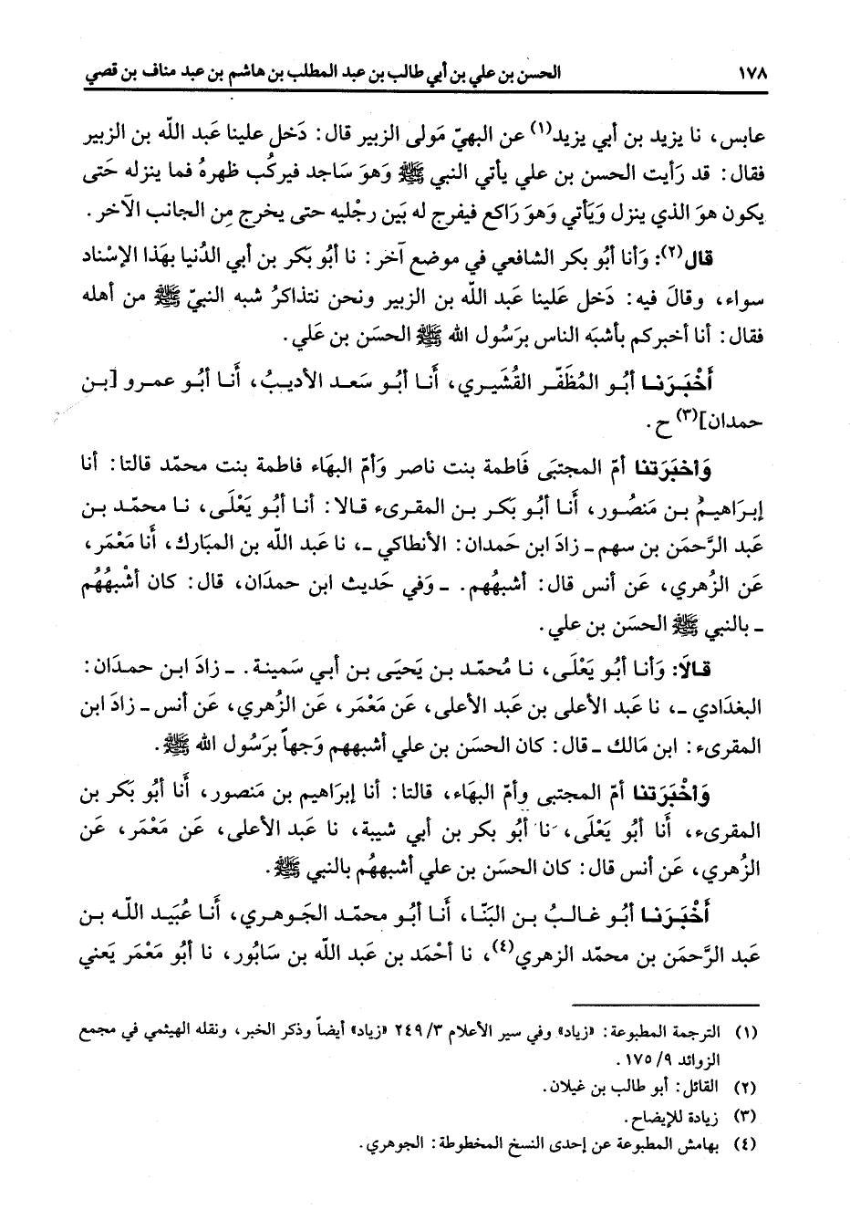 عابس نا يزيد بن أبي يزيد (1) عن البهي مولى الزبير قال دخل علينا عبد الله بن الزبير فقال قد رأيت الحسن بن علي يأتي النبي (صلى الله عليه وسلم) وهو ساجد فيركب ظهره فما ينزله حتى يكون هو الذي ينزل ويأتي وهو راكع فيفرج له بين رجليه حتى يخرج من الجانب الآخر قال (2) : وأنا أبو بكر الشافعي في موضع آخر نا أبو بكر بن أبي الدنيا بهذا الإسناد سواء وقال فيه دخل علينا عبد الله بن الزبير ونحن نتذاكر شبه النبي (صلى الله عليه وسلم) من أهله فقال أنا أخبركم بأشبه الناس برسول الله (صلى الله عليه وسلم) الحسن بن علي اخبرنا أبو المظفر القيشري انا أبو سعد الأديب أنا أبو عمرو بن حمدان (3) واخبرتنا أم المجتبى فاطمة بنت ناصر وأم البهاء فاطمة بنت محمد قالنا أنا إبراهيم بن منصور أنا أبو بكر المقرئ قالا أنا أبو يعلى نا محمد بن عبد الرحمن بن سهم زاد ابن حمدان الأنطاكي نا عبد الله بن المبارك أنا معمر عن الزهري عن انس قال اشبههم وفي حديث ابن حمدان قال كان اشبههم بالنبي (صلى الله عليه وسلم) الحسن بن علي قالا وأنا أبو يعلى نا محمد بن يحيى بن أبي سمينة زاد ابن حمدان البغدادي نا عبد الاعلى بن عبد الاعلى عن معمر عن الزهري عن انس زاد ابن المقرئ ابن مالك قال كان الحسن بن علي اشبههم وجها برسول الله (صلى الله عليه وسلم) واخبرتنا أم المجتبي وأم البهاء قالتا أنا إبراهيم بن منصور أنا أبو بكر بن المقرئ أنا أبو يعلى نا أبو بكر بن أبي شبيه نا عبد الاعلى عن معمر عن الزهري عن انس قال كان الحسن بن علي اشبههم بالنبي (صلى الله عليه وسلم) اخبرنا أبو غالب بن البنا أنا أبو محمد الجوهري أنا عبيد الله بن عبد الرحمن بن محمد الزهري (4) نا احمد بن عبد الله بن سابور نا أبو معمر يعني