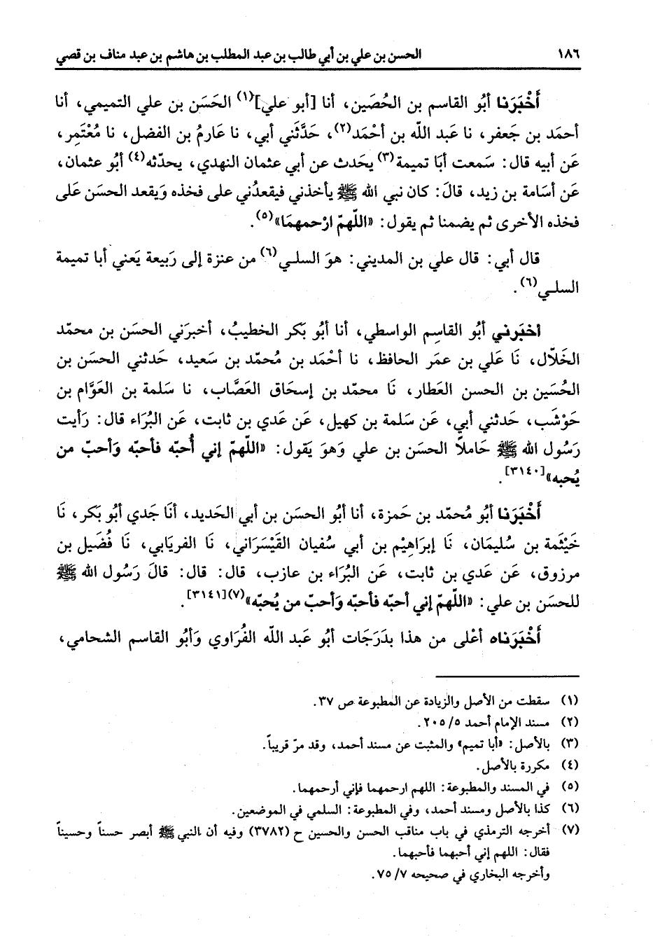 (7) أخرجه الترمذي في باب مناقب الحسن والحسين ح (3782) وفيه أن النبي صلى الله عليه وآله وسلم أبصر حسنا وحسينا فقال: اللهم إنهم أحبهما فأحبهما