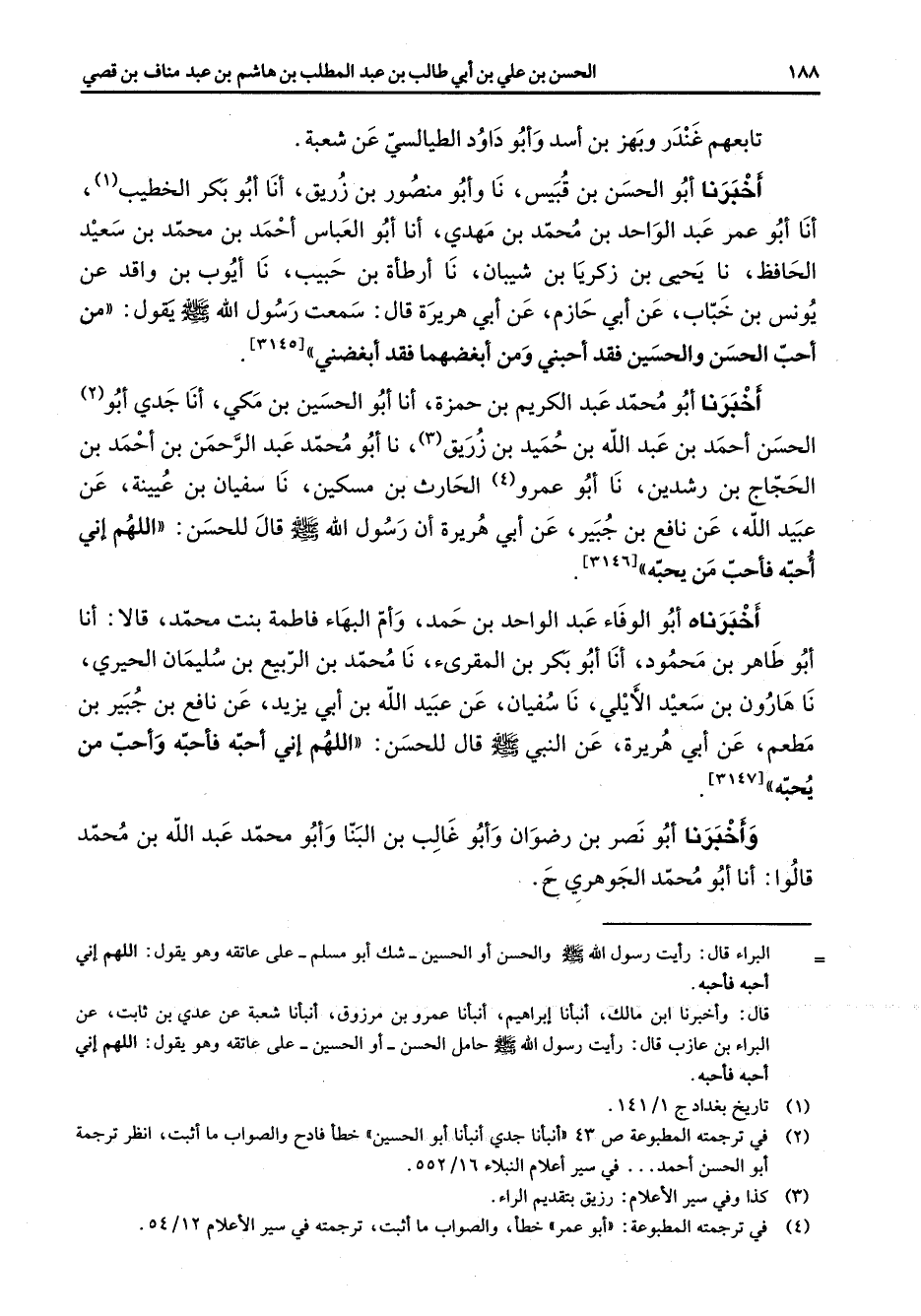 تابعهم غنذر وبهز بن أسد وأبو داود الطيالسي عن شعبة واخبرنا أبو الحسن بن قبيس نا أبو منصور بن زريق أنا أبو بكر الخطيب (1) أنا أبو عمر عبد الواحد بن محمد بن مهدي أنا أبو العباس احمد بن محمد بن سعيد الحافظ نا يحيى بن زكريا بن شيبان نا ارطأة بن حبيب نا أيوب بن واقد عن يونس بن خباب عن أبي حازم عن أبي هريرة قال سمعت رسول الله (صلى الله عليه وسلم) يقول من احب الحسن والحسين فقد احبني ومن ابغضهما فقد ابغضني اخبرنا أبو محمد عبد الكريم بن حمزة أنا أبو الحسين بن مكي أنا جدي أبو (2) الحسن احمد بن عبد الله بن حميد بن زريق (3) نا أبو محمد عبد الرحمن بن احمد بن الحجاج بن رشدين نا أبو عمرو (4) الحارث بن مسكين نا سفيان بن عيينة عن عبيد الله عن نافع بن جبير عن أبي هريرة أن رسول الله (صلى الله عليه وسلم) قال للحسن اللهم أني احبه فأحب من يحبه أخبرناه أبو الوفاء عبد الواحد بن حمد وأم البهاء فاطمة بنت محمد قالا أنا أبو طاهر بن محمود أنا أبو بكر بن المقرئ نا محمد بن الربيع بن سليمان الحيري نا هارون بن سعيد الايلي نا سفيان عن عبيد الله بن أبي يزيد عن نافع بن جبير بن مطعم عن أبي هريرة عن النبي (صلى الله عليه وسلم) قال للحسن اللهم أني احبه فأحبه واحب من يحبه واخبرنا أبو نصر بن رضوان وأبو غالب بن البنا وأبو محمد عبد الله بن محمد قالوا أنا أبو محمد الجوهري