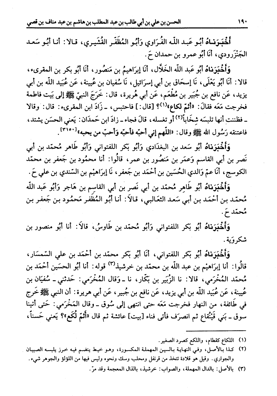أخبرناه أبو عبد الله الفراوي وأبو المظفر القشيري قالا أنا أبو سعد الجنزرودي أنا أبو عمرو بن حمدان واخبرناه أبو عبد الله الخلال أنا إبراهيم بن منصور أنا أبو بكر بن المقرئ قالا أنا أبو يعلي نا إسحاق بن أبي إسرائيل نا سفيان بن عيينة عن عبيد الله بن أبي يزيد عن نافع بن جبير بن مطعم عن أبي هريرة قال خرج النبي (صلى الله عليه وسلم) إلى بيت فاطمة فخرجت معه فقال اثم لكاع (1) ؟ قال فاحتبس زاد ابن المقرئ قال وقالا فظننت أنها تلبسه شخابا (2) أو تغسله قال فجاء زاد بن حمدان يعني الحسن يشتد فاعتنقه رسول الله (صلى الله عليه وسلم) وقال اللهم إني احبه فأحبه واحب من يحبه واخبرناه أبو سعد بن البغدادي وأبو بكر اللفتواني وأبو طاهر محمد بن أبي نصر بن أبي القاسم وعمر بن منصور بن عمر قالوا أنا محمود بن جعفر بن محمد الكوسج أنا عم والدي الحسين بن احمد بن جعفر نا إبراهيم بن السندي بن علي واخبرناه أبو طاهر محمد بن أبي نصر أبي القاسم بن هاجر وأبو عبد الله محمد بن احمد بن أبي سعد الثعالبي قالا أنا أبو المظفر محمود بن جعفر بن محمد واخبرناه أبو بكر اللفتواني وأبو محمد بن طاوس قالا أنا أبو منصور بن شكروية واخبرناه أبو بكر اللفتواني أبا أبو بكر محمد بن احمد بن علي السمسار قالوا أنا إبراهيم بن عبد الله بن محمد بن خرشيذ (3) قوله أنا أبو الحسين احمد بن محمد المخرمي قالا نا الزبير بن بكار نا وقال المخرمي حدثني سفيان بن عيينة عن عبيد الله بن أبي يزيد عن نافع بن جبير عن أبي هريرة أن النبي (صلى الله عليه وسلم) خرج في طائفة من النهار فخرجت معه حتى انتهى إلى سوق وقال المخرمي حتى أتينا سوق بني قينقاع ثم انصرف فأتى فناء بيت عائشة ثم قال أثم لكع يعني حسنا