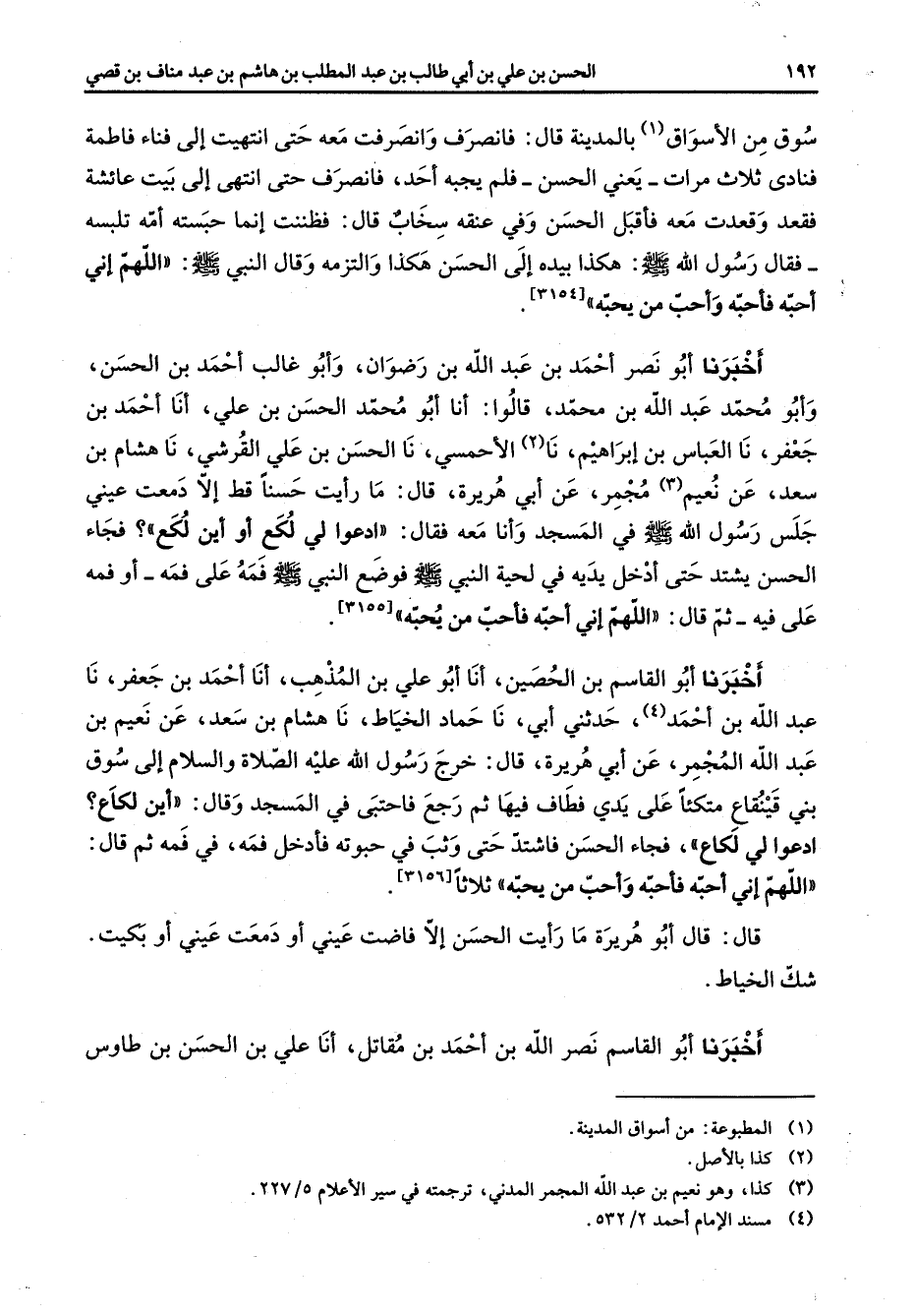 سوق من الأسواق (1) بالمدينة قال فانصرف وانصرفت معه حتى انتهيت إلى فناء فاطمة فنادى ثلاث مرات يعني الحسن فلم يجبه أحد فانصرف حتى انتهى إلى بيت عائشة فقعد وقعدت معه فأقبل الحسن وفي عنفه سخاب قال فظننت إنما حبسته امه تلبسه فقال رسول الله (صلى الله عليه وسلم) هكذا بيده إلى الحسن هكذا والتزمه وقال النبي (صلى الله عليه وسلم) اللهم أني احبه فأحبه واحب من يحبه اخبرنا أبو نصر أحمد بن عبد الله بن رضوان وأبو غالب احمد بن الحسن وأبو محمد عبد الله بن محمد قالوا أنا أبو محمد الحسن بن علي أنا احمد بن جعفر نا العباس بن إبراهيم نا (2) الاحمسي نا الحسن بن علي القرشي نا هشام بن سعد عن نعيم (3) مجمر عن أبي هريرة قال ما رأيت حسنا قط إلا دمعت عيني جلس رسول الله (صلى الله عليه وسلم) في المسجد وأنا معه فقال ادعوا لي لكع أو أين لكع فجاء الحسن يشتد حتى ادخل يديه في لحية النبي (صلى الله عليه وسلم) فوضع النبي (صلى الله عليه وسلم) فمه على فمه أو فمه على فيه ثم قال اللهم أني احبه فأحب من يحبه اخبرنا أبو القاسم بن الحصين أنا أبو علي بن المذهب أنا احمد بن جعفر نا عبد الله بن احمد (4) حدثني أبي نا حماد الخياط نا هشام بن سعد عن نعيم بن عبد الله المجمر عن أبي هريرة قال خرج رسول الله عليه الصلاة والسلام إلى سوق بني قينقاع متكئا على يدي فطاف فيها رجع فاحتبى في المسجد وقال أين لكاع ادعوا لي لكاع فجاء الحسن فاشتد حتى وثب في حبوته فأدخل فمه في فمه ثم قال اللهم أني احبه فأحبه واحب من يحبه ثلاثا قال قال أبو هريرة ما رأيت الحسن إلا فاضت عيني أو دمعت عيني أو بكيت شك الخياط اخبرنا أبو القاسم نصر الله بن احمد بن مقاتل أنا علي بن الحسن بن طاوس
