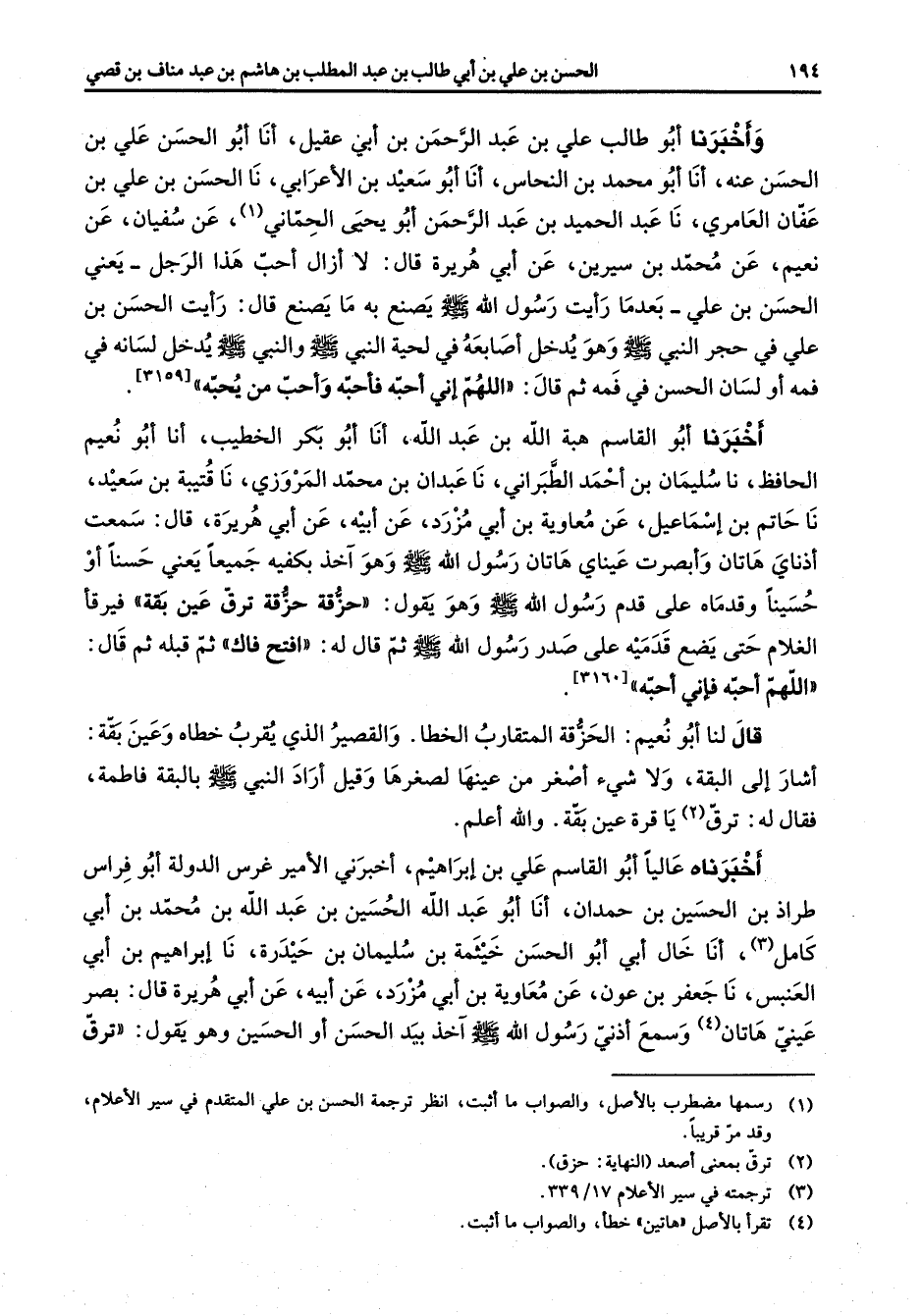 واخبرنا أبو طالب علي بن عبد الرحمن بن أبي عقيل أنا أبو الحسن علي بن الحسن عنه أنا أبو محمد بن النحاس أنا أبو سعيد بن الأعرابي نا الحسن بن علي بن عفان العامري نا عبد الحميد بن عبد الرحمن أبو يحيى الحماني (1) عن سفيان عن نعيم عن محمد بن سيرين عن أبي هريرة قال لا ازال احب هذا الرجل يعني الحسن بن علي بعدما رأيت رسول الله (صلى الله عليه وسلم) يصنع به ما يصنع قال رأيت الحسن بن علي في حجر النبي (صلى الله عليه وسلم) وهو يدخل اصابعه في لحية النبي (صلى الله عليه وسلم) والنبي (صلى الله عليه وسلم) يدخل لسانه في فمه أو لسان الحسن في فمه ثم قال اللهم أني احبه فأحبه واحب من يحبه اخبرنا أبو القاسم هبة الله بن عبد الله أنا أبو بكر الخطيب أنا أبو نعيم الحافظ نا سليمان بن احمد الطبراني نا عبدان بن محمد المروزي نا قتيبة بن سعيد نا حاتم بن إسماعيل عن معاوية بن أبي مزرد عن أبيه عن أبي هريرة قال سمعت اذناي هاتان وأبصرت عيناي هاتان رسول الله (صلى الله عليه وسلم) وهو آخذ بكفيه جميعا يعني حسنا أو حسينا وقدماه على قدم رسول الله (صلى الله عليه وسلم) ثم وهو يقول حزقه حزقة ترق عين بقة فيرفأ الغلام حتى يضع قدميه على صدر رسول الله (صلى الله عليه وسلم) قال له افتح فاك ثم قبله ثم قال اللهم احبه فأني احبه قال لنا أبو نعيم الحزقة المتقارب الخطا والقصير الذي يقرب خطاه وعين بقة أشار إلى البقة ولا شئ اصلإر من عينها لصغرها وقيل اراد النبي (صلى الله عليه وسلم) بالبقة فاطمة فقال له ترق (2) يا قرة عين بقة والله اعلم