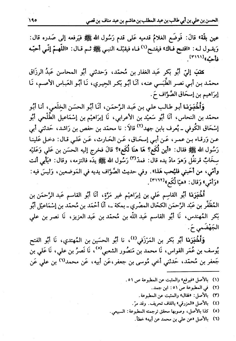عين بقة فوضع الغلام قدميه على قدم رسول الله (صلى الله عليه وسلم) فيرفعه إلى صدره قال ويقول له افتح فاك فيفتح (1) فاه فيقبله النبي (صلى الله عليه وسلم) ثم قال اللهم أني احبه فأحبه كتب إلى أبو بكر عبد الغفار بن محمد وحدثني أبو المحاسن عبد الرزاق محمد بن أبي نصر الطبسي عنه أنا أبو بكر الحيري نا أبو العباس الاصم نا إبراهيم بن إسحاق الصواف واخبرنا أبو طالب علي بن عبد الرحمن أنا أبو الحسن الخلعي أنا أبو محمد بن النحاس أنا أبو سعيد بن الأعرابي نا إبراهيم بن إسماعيل الطلحي أبو إسحاق الكوفي يعرف بابن جهد (2) قالا نا محمد بن حفص بن راشد حدثني أبي عن ورقاء بن عمر عن أبي إسحاق عن الحارث عن علي قال دخل علينا رسول الله (صلى الله عليه وسلم) فقال أين لكع ها هنا لكع قال فخرج إليه الحسن بن علي وعليه سخاب قرنفل وهو ماد يده قال فمد (3) رسول الله (صلى الله عليه وسلم) يده فالتزمه وقال بأبي أنت وامي من احبني فليحب هذا وفي حديث الصواف يديه في الموضعين وليس فيه وامي وقال هيا لكع اخبرنا أبو القاسم علي بن إبراهيم غير مرة أنا أبو القاسم عبد الرحمن بن المظفر بن عبد الرحمن الكحال المصري بمكة أنا احمد بن محمد بن إسماعيل أبو بكر المهندس نا أبو القاسم عبد الله بن محمد بن عبد العزيز نا نصر بن علي الجهمضمي واخبرنا أبو بكر بن المرزفي (4) نا أبو الحسين بن المهتدي نا أبو الفتح يوسف بن عمر القواس نا محمد بن منصور الشعبي (5) نا نصر بن علي نا علي بن جعفر بن محمد حدثني اخي موسى بن جعفر عن أبيه عن محمد (6) بن علي عن