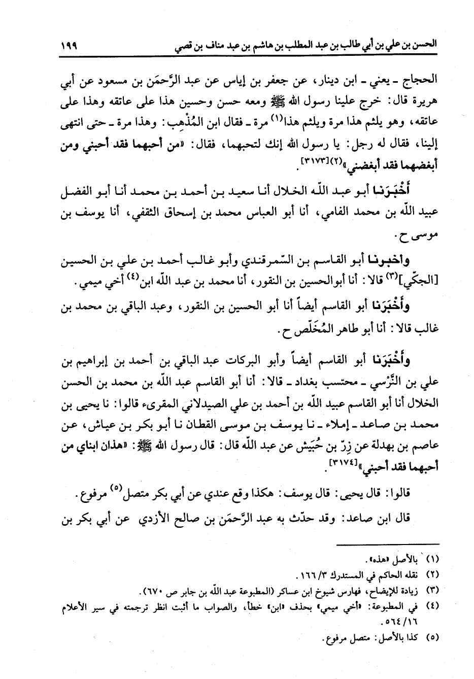 الحجاج يعني ابن دينار عن جعفر بن اياس بن عبد الرحمن بن مسعود عن أبي هريرة قال خرج علينا رسول الله (صلى الله عليه وسلم) ومعه حسن وحسين هذا على عاتقه وهذا على عاتقة وهو يلثم هذا (1) مرة فقال ابن المذهب وهذا مرة حتى انتهى إلينا فقال له رجل يا رسول الله انك لتحبهما فقال من احبهما فقد احبني ومن ابغضهما فقد ابغضني اخبرنا أبو عبد الله الخلال أنا سعيد بن احمد بن محمد أنا أبو الفضل عبيد الله بن محمد الفامي أنا أبو العباس محمد بن إسحاق الثقفي أنا يوسف بن موسى واخبرنا أبو القاسم بن السمرقندي وأبو غالب احمد بن علي بن الحسين الجكي (3) قالا أنا أبو الحسين بن النقور أنا محمد بن عبد الله ابن (4) اخي ميمي واخبرنا أبو القاسم أيضا أنا أبو الحسين بن النقور وعبد الباقي بن محمد بن غالب قالا أنا أبو طاهر المخلص واخبرنا أبو القاسم أيضا وأبو البركات عبد الباقي بن احمد بن إبراهيم بن علي بن النرسي محتسب بغداد قالا أنا أبو القاسم عبد الله بن محمد بن الحسن الخلال أنا أبو القاسم عبيد الله بن احمد بن علي الصيدلاني المقرئ قالوا نا يحيى بن محمد بن صاعد إملاء نا يوسف بن موسى القطان نا أبو بكر بن عياش عن عاصم بن بهدله عن زر بن حبيش عن عبد الله قال قال رسول الله (صلى الله عليه وسلم) هذان ابناي من احبهما فقد احبني قالوا قال يحيى قال يوسف هكذا وقع عندي عن أبي بكر متصل (5) مرفوع قال ابن صاعد وقد حدث به عبد الرحمن بن صالح الازدي عن أبي بكر بن