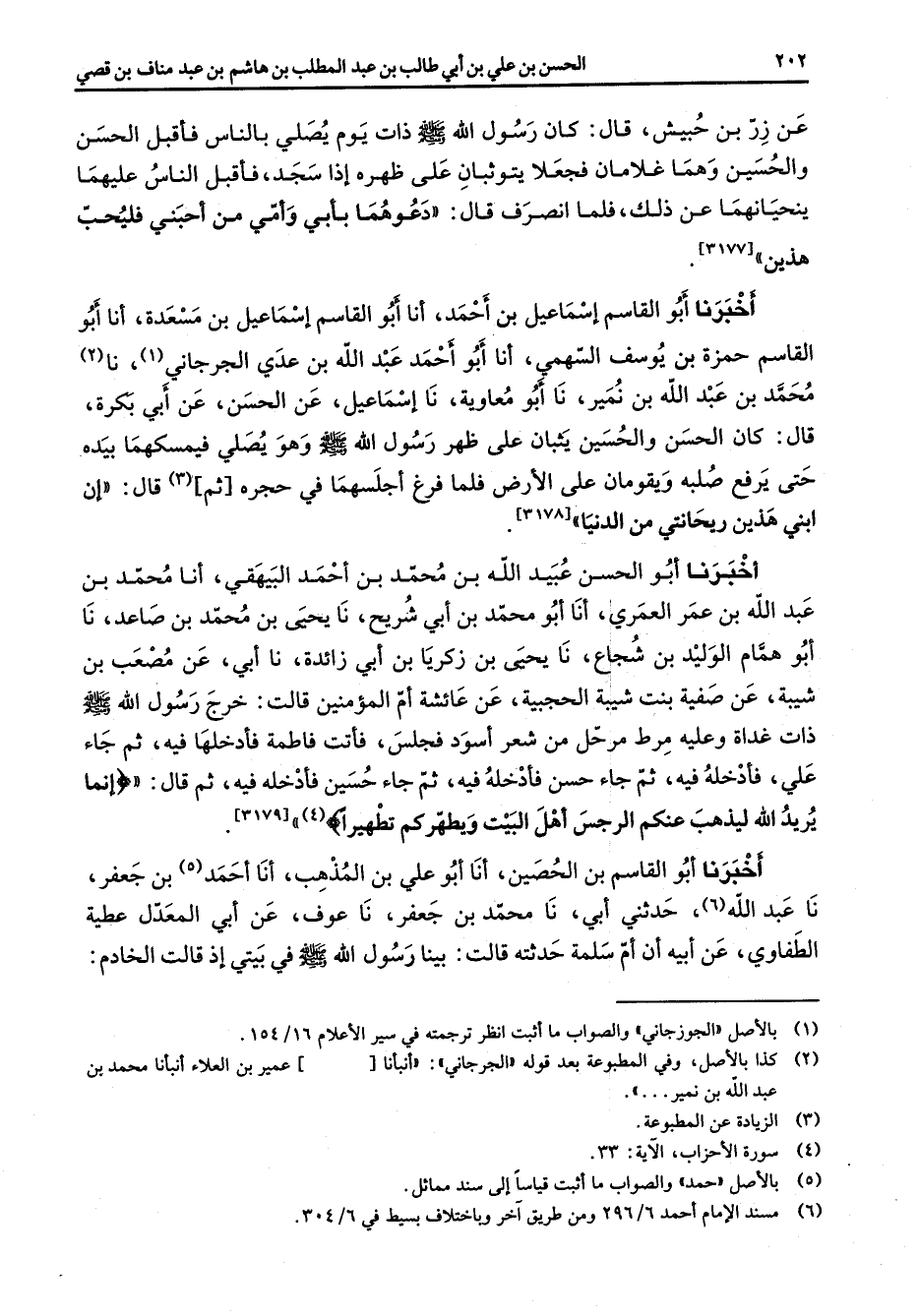 عن زر بن حبيش قال كان رسول الله (صلى الله عليه وسلم) ذات يوم يصلي بالناس فأقبل الحسن والحسين وهما غلامان فجعلا يتوثبان على ظهره إذا سجد فأقبل الناس عليهما ينحيانهما عن ذلك فلما انصرف قال دعوهما بأبي وامي من احبني فليجب هذين اخبرنا أبو القاسم إسماعيل بن احمد أنا أبو القاسم إسماعيل بن مسعدة أنا أبو القاسم حمزة بن يوسف السهمي أنا أبو احمد عبد الله بن عدي الجرجاني (1) نا (2) محمد بن عبد الله بن نمير نا أبو معاوية نا إسماعيل عن الحسن عن أبي بكرة قال: كان الحسن والحسين يثبان على ظهر رسول الله (صلى الله عليه وسلم) وهو يصلي فيمسكهما بيده حتى يرفع صلبه ويقومان على الأرض فلما فرغ اجلسهما في حجرة ثم (3) قال أن ابني هذين ريحانتي من الدنيا اخبرنا أبو الحسن عبيد الله بن محمد بن احمد البيهقي أنا محمد بن عبد الله بن عمر العمري أنا أبو محمد بن أبي شريح نا يحيى بن محمد بن صاعد نا أبو همام الوليد بن شجاع نا يحيى بن زكريا بن أبي زائدة نا أبي عن مصعب بن شيبة عن صفية بنت شيبة الحجبية عن عائشة أم المؤمنين قالت خرج رسول الله (صلى الله عليه وسلم) ذات غداة وعليه مرط مرحل من شعر اسود فجلس فأتت فاطمة فأدخلهما فيه ثم جاء على فأدخله فيه ثم جاء حسن فأدخله فيه ثم جاء حسين فأدخله فيه ثم قال أنما يريد الله ليذهب عنكم الرجس أهل البيت ويطهركم تطهيرا (4) اخبرنا أبو القاسم بن الحصين أنا أبو علي بن المذهب أنا احمد (5) بن جعفر نا عبد الله (6) حدثني أبي نا محمد بن جعفر نا عوف عن أبي المعدل عطية الطفاوي عن أبيه أن أم سلمة حدثته قالت بينا رسول الله (صلى الله عليه وسلم) في بيتي إذ قالت الخادم