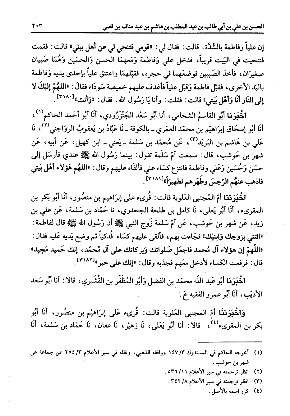 أن عليا وفاطمة بالسدة قالت فقال لي قومي فتنحي لي عن أهل بيتي قالت فقمت فتنحيت في البيت قريبا فدخل علي وفاطمة ومعهما الحسن والحسين وهما صبيان صغيران فأخذ الصبيين فوضعهما في حجرة فقبلهما واعتنق علينا بإحدى يديه وفاطمة باليد الأخرى فقبل فاطمة وقبل عليا فأغدف عليهم خميصة سوداء فقال اللهم اليك لا إلى النار أنا وأهل بيتي قالت فقلت وأنا يا رسول الله فقال وأنت اخبرنا أبو القاسم الشحامي أنا أبو سعد الجنزرودي أنا أبو أحمد الحاكم (1) أنا أبو إسحاق إبراهيم بن محمد العمري بالكوفة نا عباد بن يعقوب الرواجني (2) نا علي بن هاشم بن البريد (3) عن محمد بن سلمة يعني ابن كهيل عن أبيه عن شهر بن حوشب قال سمعت أم سلمة تقول بينما رسول الله (صلى الله عليه وسلم) عندي فأرسل إلى حسن وحسين وعلي وفاطمة فانتزع كساء عني فألقاه عليهم وقال اللهم هؤلاء أهل بيتي فاذهب عنهم الرجس وطهرهم تطهيرا اخبرتنا أم المجتبى العلوية قالت قرئ على إبراهيم بن منصور أنا أبو بكر بن المقرئ أنا أبو يعلي نا كامل بن طلحة الجحدري نا حماد بن سلمة عن علي بن زيد عن شهر بن حوشب عن أم سلمة زوج النبي (صلى الله عليه وسلم) أن رسول الله (صلى الله عليه وسلم) قال لفاطمة ائتني بزوجك وابنيك فجاءت بهم فألقى عليهم كساء فدكيا ثم وضع يديه عليه فقال اللهم إن هؤلاء آل محمد فاجعل صلواتك وبركاتك على آل محمد انك حميد مجيد قال فرفعت الكساء لادخل معهم فجذبه وقال انك على خير اخبرنا أبو عبد الله محمد بن الفضل وأبو المظفر بن القشيري قالا أنا أبو سعد الأديب أنا أبو عمرو الفقيه واخبرتنا أم المجتبي العلوية قالت قرئ على إبراهيم بن منصور أنا أبو بكر بن المقرئ (4) قالا أنا أبو يعلي نا زهير نا عفان نا حماد بن سلمة أنا