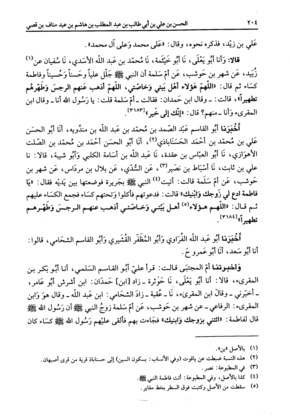 علي بن زيد فذكره نحوه وقال على محمد وعلى آل محمد قالا وأنا أبو يعلي نا أبو خيثمة نا محمد بن عبد الله الاسدي نا سفيان عن (1) زبيد عن شهر بن حوشب عن أم سلمة أن النبي (صلى الله عليه وسلم) جلل عليا وحسنا وحسينا وفاطمة كساء ثم قال اللهم هؤلاء أهل بيتي وخاصتي اللهم اذهب عنهم الرجس وطهرهم تطهيرا قالت وقال ابن حمدان فقالت أم سلمة قلت يا رسول الله أنا وقال ابن المقرئ وأنا منهم قال انك الي خير اخبرنا أبو القاسم بن عبد الصمد بن محمد بن عبد الله بن مندويه أنا أبو الحسن علي بن محمد بن احمد الحسناباذي (2) أنا أبو الحسن احمد بن محمد بن الصلت الاهوازي نا أبو العباس بن عقدة نا عبد الله بن اسامة الكلبي وأبو شيبة قالا نا علي بن ثابت نا اسباط بن نصير (3) عن السدي عن بلال بن مرداس عن شهر بن حوشب عن أم سلمة قالت أتيت (4) النبي (صلى الله عليه وسلم) بجريرة فوضعتها بين يديه فقال يا فاطمة ادع لي زوجك وابنيك قالت فدعوتهم فأكلوا وتحتهم كساء فجمع الكساء عليهم ثم قال اللهم هؤلاء (5) أهل بيتي وخاصتي اذهب عنهم الرجس وطهرهم تطهيرا اخبرنا أبو عبد الله الفراوي وأبو المظفر القيشري وأبو القاسم الشحامي قالوا أنا أبو سعد أنا أبو عمرو واخبرتنا المجتبى قالت قرأ علي أبو القاسم السلمي أنا أبو بكر بن المقرئ قالا أنا أبو يعلي نا حوثرة زاد ابن حمدان ابن اشرش أبو عامر اخبرني وقال ابن تالمقرئ نا عقبة زاد الشحامي ابن عبد الله وقال هو وابن المقرئ الرفاعي عن شهر بن حوشب عن أم سلمة زوج النبي (صلى الله عليه وسلم) أن رسول الله (صلى الله عليه وسلم) قال لفاطمة ائتني بزوجك وابنيك فجاءت بهم فألقى عليهم رسول الله (صلى الله عليه وسلم) كساء كان