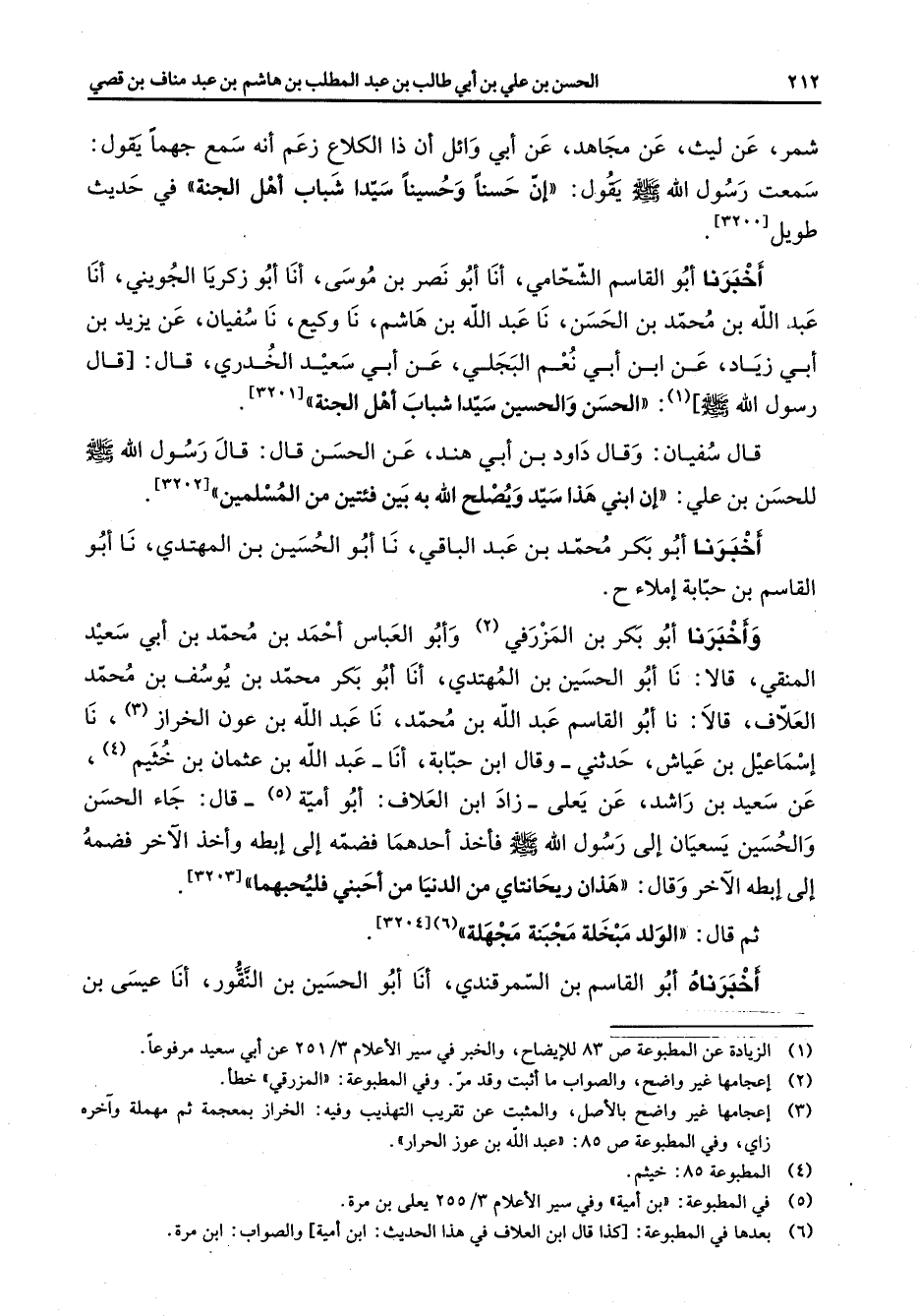 شمر عن ليث عن مجاهد عن أبي وائل أن ذا الكلاع زعم انه سمع جهما يقول سمعت رسول الله (صلى الله عليه وسلم) يقول أن حسنا وحسنيا سيدا شباب أهل الجنة في حديث طويل اخبرنا أبو القاسم الشحامي أنا أبو نصر بن موسى أنا أبو زكريا الجويني أنا عبد الله بن محمد بن الحسن نا عبد الله بن هاشم نا وكيع نا سفيان عن يزيد بن أبي زياد عن ابن أبي نعم البجلي عن أبي سعيد الخدري قال قال رسول الله (صلى الله عليه وسلم) (1) الحسن والحسين سيدا شباب أهل الجنة قال سفيان وقال داود بن أبي هند عن الحسن قال قال رسول الله (صلى الله عليه وسلم) للحسن بن علي إن ابني هذا سيد ويصلح الله به بين فئتين من المسلمين اخبرنا أبو بكر محمد بن عبد الباقي نا أبو الحسين بن المهتدي أنا أبو القاسم بن حبابة إملاء واخبرنا أبو بكر بن المزرقي (2) وأبو العباس احمد بن محمد بن أبي سعيد المنقي قالا نا أبو الحسين بن المهتدي أنا أبو بكر محمد بن يوسف بن محمد العلاف قالا نا أبو القاسم عبد الله بن محمد نا عبد الله بن عون الخراز (3) نا إسماعيل بن عياش حدثني وقال ابن حبابة أنا عبد الله بن عثمان بن خثيم (4) عن سعيد بن راشد عن يعلي زاد ابن العلاف أبو أمية (5) قال جاء الحسن والحسين يسعيان إلى رسول الله (صلى الله عليه وسلم) فأخذ أحدهما فضمه إلى ابطه وأخذ الآخر فضمه إلى إبطه الآخر وقال هذان ريحانتاي من الدنيا من احبني فليحبهما ثم قال الولد مبخلة مجبنة مجهلة (6) أخبرناه أبو القاسم بن السمرقندي نا أبو الحسين بن النقور أنا عيسى بن