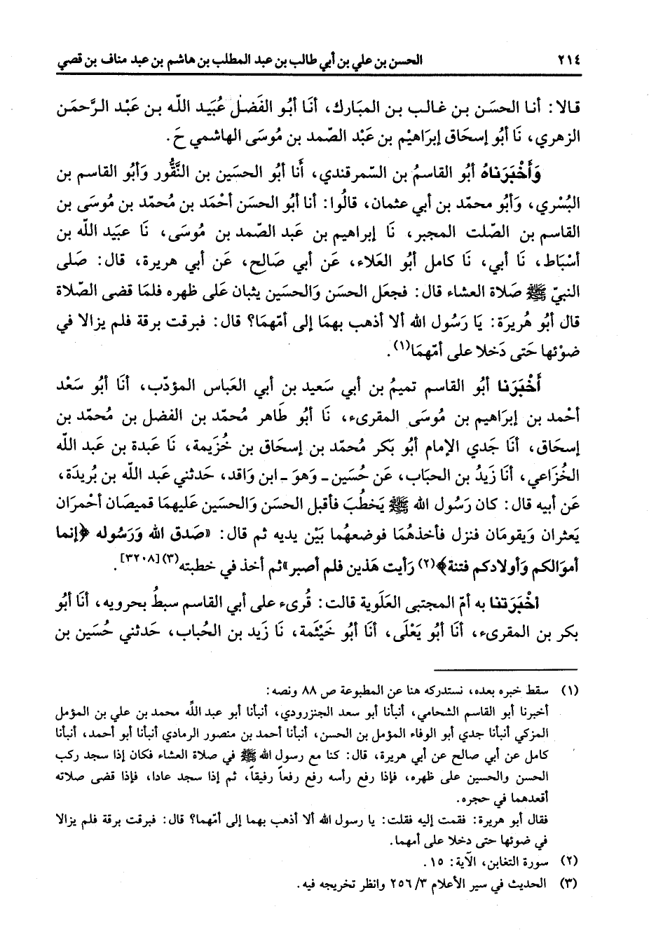 (1) سقط خبره بعده نستدركه هنا عن المطبوعة ص 88 ونصه: أخبرنا أبو القاسم الشحامي أنبأنا أبو سعد الجنزرودي أنبأنا أبو عبد الله محمد بن علي بن المؤمل المزكي أنبأنا جدي أبو الوفاء المؤمل بن الحسين أنبأنا أحمد بن منصور الرمادي أنبأنا أبو أحمد أنبأنا كامل عن أبي صالح عن أبي هريرة قال: كنا مع رسول الله صلى الله عليه وآله وسلم في صلاة العشاء فكان إذا سجد ركب الحسن والحسين على ظهره فإذا رفع رأسه رفع رفعا رفيقا ثم إذا سجد عادا فإذا قضى صلاته أقعدهما في حجره