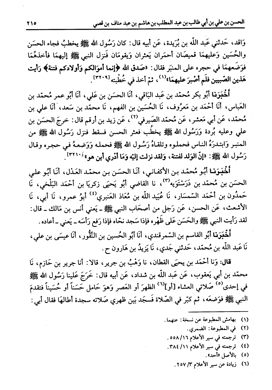 واقد حدثني عبد الله بن بريدة عن أبيه قال كان رسول الله (صلى الله عليه وسلم) يخطب فجاء الحسن والحسين وعليهما قميصان أحمران يعثران ويقومان فنزل النبي (صلى الله عليه وسلم) إليهما فأخذهما فوضعهما في حجرة على المنبر فقال صدق الله (إنما أموالكم وأولادكم فتنة) رأيت هذين الصبيين فلم اصبر عليهما (1) ثم اخذ في خطبته اخبرنا أبو بكر محمد بن عبد الباقي أنا الحسن بن علي أنا أبو عمر محمد بن العباس أنا احمد بن معروف نا الحسين بن الفهم نا محمد بن سعد أنا علي بن محمد عن أبي معشر عن محمد الصيرفي (2) عن زيد بن ارقم قال خرج الحسن بن علي وعليه بردة ورسول الله (صلى الله عليه وسلم) يخطب فعثر الحسن فسقط فنزل رسول الله (صلى الله عليه وسلم) من المنبر وابتدره الناس فحملوه وتلقاه رسول الله (صلى الله عليه وسلم) فحمله ووضعه في حجره وقال رسول الله (صلى الله عليه وسلم) إن الولد لفتنة ولقد نزلت إليه وما ادري أين هو اخبرنا أبو محمد بن ألا كفاني أنا الحسن بن محمد العدل أنا أبو علي الحسن بن محمد بن درستويه (3) نا القاضي أبو يحيى زكريا بن احمد البلخي نا حمدون بن احمد السمسار نا عبيد الله بن معاذ العنبري (4) أبو عمرو نا أبي نا الاشعت عن الحسن عن رجل من أصحاب النبي (صلى الله عليه وسلم) يعني انس بن مالك قال لقد رأيت النبي (صلى الله عليه وسلم) والحسن على ظهره فإذا سجد نحاه فإذا رفع رأسه يعني أعاده اخبرنا أبو القاسم بن السمرقندي أنا أبو الحسين بن النقور أنا عيسى بن علي نا عبد الله بن محمد حدثني جدي نا يزيد بن هارون قال ونا احمد بن يحيى القطان نا وهب بن جرير قالا أنا جرير بن حازم نا محمد بن أبي يعقوب عن عبد الله بن شداد عن أبيه قال خرج علينا رسول الله (صلى الله عليه وسلم) في احدي (5) صلاتي العشاء أو (6) الظهر أو العصر وهو حامل حسنا أو حسينا فتقدم النبي (صلى الله عليه وسلم) فوضعه ثم كبر في الصلاة فسجد بين ظهري صلاته سجدة اطالها فقال أبي