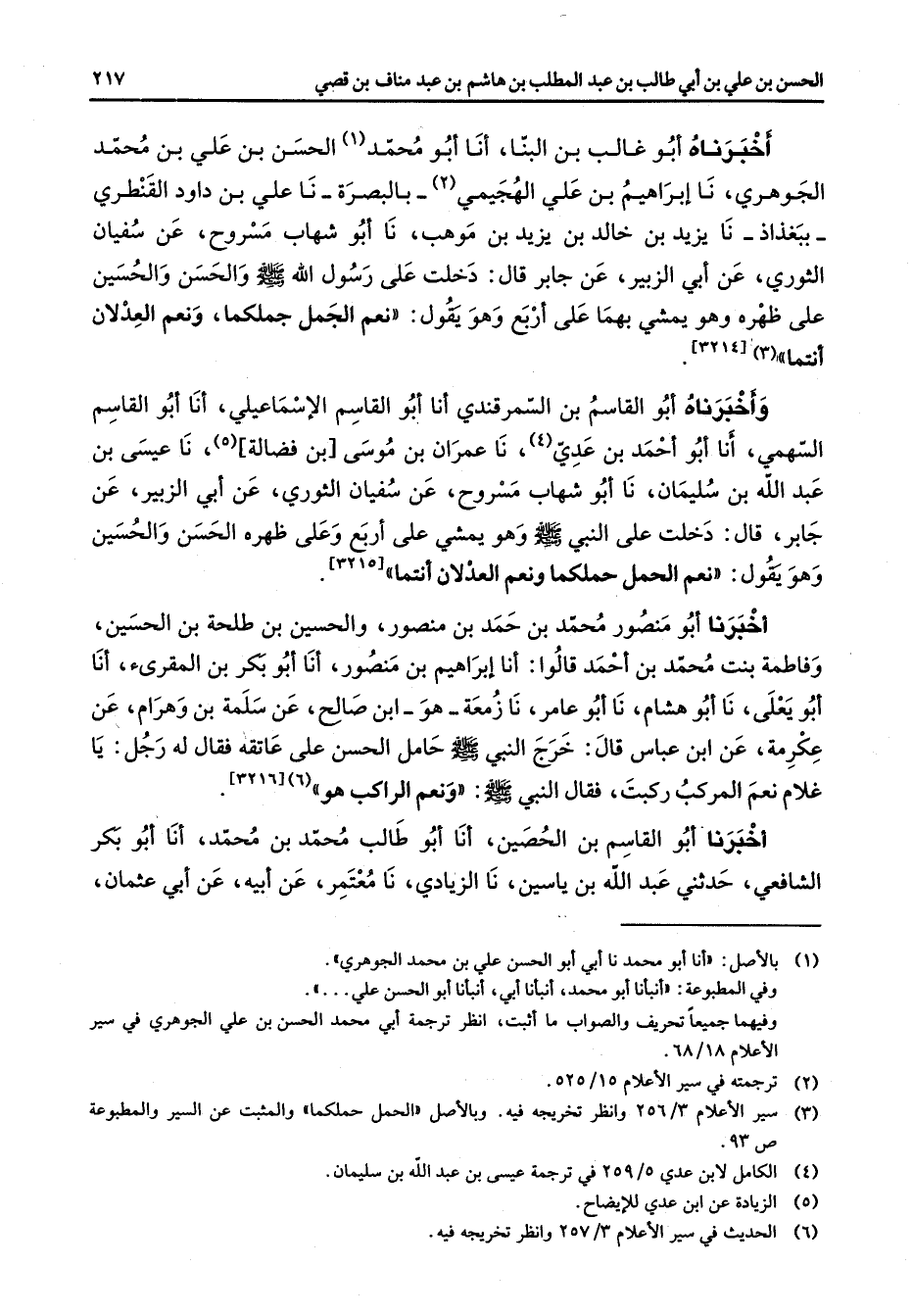 أخبرناه أبو غالب بن البنا أنا أبو محمد (1) الحسن بن علي بن محمد الجوهري نا إبراهيم بن علي الهجيمي (2) بالبصرة نا علي بن داود القنطري ببغذاذ نا يزيد بن خالد بن يزيد بن موهب نا أبو شهاب مسروح عن سفيان الثوري عن أبي الزبير عن جابر قال دخلت على رسول الله (صلى الله عليه وسلم) والحسن والحسين على ظهره وهو يمشي بهما على أربع وهو يقول نعم الجمل جملكما ونعم العدلان أنتما (3) واخبرناه أبو القاسم بن السمرقندي أنا أبو القاسم الإسماعيلي أنا أبو القاسم السهمي أنا أبو احمد بن عدي (4) نا عمران بن موسى بن فضالة (5) نا عيسى بن عبد الله بن سليمان نا أبو شهاب مسروح عن سفيان الثوري عن أبي الزبير عن جابر قال دخلت على النبي (صلى الله عليه وسلم) وهو يمشي على أربع وعلى ظهره الحسن والحسين وهو يقول نعم الحمل حملكما ونعم العدلان أنتما اخبرنا أبو منصور محمد بن حمد بن منصور والحسين بن طلحة بن الحسين وفاطمة بنت محمد بن احمد قالوا أنا إبراهيم بن منصور أنا أبو بكر بن المقرئ أنا أبو يعلى نا أبو هشام نا أبو عامر نا زمعة هو ابن صالح عن سلمة بن وهرام عن عكرمة عن ابن عباس قال خرج النبي (صلى الله عليه وسلم) حامل الحسن على عاتقه فقال له رجل يا غلام نعم المركب ركبت فقال النبي (صلى الله عليه وسلم) ونعم الراكب هو (6) اخبرنا أبو القاسم بن الحصين أنا أبو طالب محمد بن محمد أنا أبو بكر الشافعي حدثني عبد الله بن ياسين نا الزيادي نا معتمر عن أبيه عن أبي عثمان