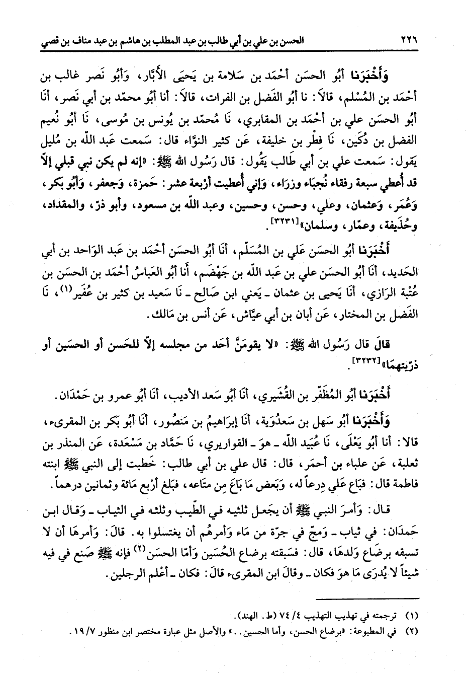 واخبرنا أبو الحسن احمد بن سلامة بن يحيى الابار وأبو نصر غالب بن احمد بن المسلم قالا نا أبو الفضل بن الفرات قالا أنا أبو محمد بن أبي نصر أنا أبو الحسن علي بن احمد بن المقابري نا محمد بن يونس بن موسى نا أبو نعيم الفضل بن دكين نا فطر بن خليفة عن كثير النواء قال سمعت عبد الله بن مليل يقول سمعت علي بن أبي طالب يقول قال رسول الله (صلى الله عليه وسلم) انه لم يكن نبي قبلي إلا قد اعطي سبعة رفقاء نجباء وزراء واني اعطيت أربعة عشر حمزة وجعفر وأبو بكر وعمر وعثمان وعلي وحسن وحسين وعبد الله بن مسعود وأبو ذر والمقداد وحذيفة وعمار وسلمان اخبرنا أبو الحسن علي بن المسلم أنا أبو الحسن احمد بن عبد الواحد بن أبي الحديد أنا أبو الحسن علي بن عبد الله بن جهضم أنا أبو العباس احمد بن الحسن بن عتبة الرازي أنا يحيى بن عثمان يعني ابن صالح نا سعيد بن كثير بن عفير (1) نا الفضل بن المختار عن ابان بن أبي عياش عن انس بن مالك قال قال رسول الله (صلى الله عليه وسلم) لا يقومن احمد من مجلسه إلا للحسن أو الحسين أو ذريتهما اخبرنا أبو المظفر بن القيشري أنا أبو سعد الأديب أنا أبو عمرو بن حمدان واخبرنا أبو سهل بن سعدوية أنا إبراهيم بن منصور أنا أبو بكر بن المقرئ قالا أنا أبو يعلى نا عبيد الله هو القواريري نا حماد بن مسعدة عن المنذر بن ثعلبة عن علباء بن احمر قال قال علي بن أبي طالب خطبت إلى النبي (صلى الله عليه وسلم) ابنته فاطمة قال فباع علي درعا له وبعض ما باع من متاعه فبلغ أربع مائة وثمانين درهما قال وامر النبي (صلى الله عليه وسلم) أن يجعل ثلثيه في الطيب وثلثه في الثياب وقال ابن حمدان في ثياب ومج في جرة من ماء وامرهم أن يغتسلوا به قال وامرها أن لا تسبقه برضاع ولدها قال فسبقته برضاع الحسين واما الحسن (2) فإنه (صلى الله عليه وسلم) صنع في فيه شيئا لا يدري ما هو فكان وقال ابن المقرئ قال فكان اعلم الرجلين