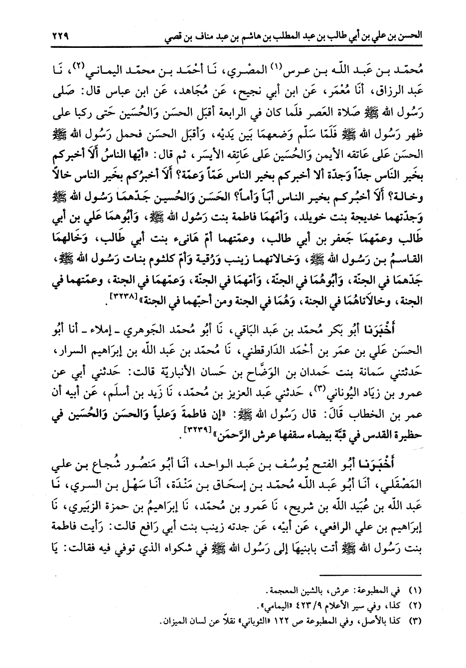 محمد بن عبد الله بن عرس (1) المصري نا احمد بن محمد اليماني (2) نا عبد الرزاق أنا معمر عن ابن أبي نجيح عن مجاهد عن ابن عباس قال صلى رسول الله (صلى الله عليه وسلم) صلاة العصر فلما كان في الرابعة اقبل الحسن والحسين حتى ركبا على ظهر رسول الله (صلى الله عليه وسلم) فلما سلم وضعهما بين يديه واقبل الحسن فحمل رسول الله (صلى الله عليه وسلم) الحسن على عاتقه الايمن والحسين على عاتقه الايسر ثم قال آيها الناس إلا أخبركم بخير الناس جدا وجدة إلا أخبركم بخير الناس عما وعمة ألا أخبركم بخير الناس خالا وخالة ألا أخبركم بخير الناس أبا وأما الحسن والحسين جدهما رسول الله (صلى الله عليه وسلم) وجدتهما خديجة بنت خويلد وأمهما فاطمة بنت رسول الله (صلى الله عليه وسلم) وأبوهما علي بن أبي طالب وعمهما جعفر بن ابي طالب وعمتهما أم هانئ بنت أبي طالب وخالهما القاسم بن رسول الله (صلى الله عليه وسلم) وخالاتاهما زينب ورقية وأم كلثوم بنات رسول الله (صلى الله عليه وسلم) جدهما في الجنة وأبوهما في الجنة وأمهما في الجنة وعمهما في الجنة وعمتهما في الجنة وخالاتاهما في الجنة وهما في الجنة ومن احبهما في الجنة اخبرنا أبو بكر محمد بن عبد الباقي نا أبو محمد الجوهري إملاء أنا أبو الحسن علي بن عمر بن احمد الدارقطني نا محمد بن عبد الله بن إبراهيم السرار حدثتني سمانة بنت حمدان بن الوضاح بن حسان الانبارية قالت حدثني أبي عن عمرو بن زياد اليوناني (3) حدثني عبد العزيز بن محمد نا زيد بن اسلم عن أبيه أن عمرو بن الخطاب قال: قال رسول الله (صلى الله عليه وآله وسلم) : ان فاطمة وعليا والحسن والحسين في حظيرة القدس في قبة بيضاء سقفها عرش الرحمن اخبرنا أبو الفتح يوسف بن عبد الواحد أنا أبو منصور شجاع بن علي المصقلي أنا أبو عبد الله محمد بن إسحاق بن مندة أنا سهل بن السري نا عبد الله بن عبيد الله بن شريح نا عمرو بن محمد نا إبراهيم بن حمزة الزبيري نا إبراهيم بن علي الرافعي عن ابيه عن جدته زينب بنت أبي رافع قالت رأيت فاطمة بنت رسول الله (صلى الله عليه وسلم) اتت بابنيها إلى رسول الله (صلى الله عليه وسلم) في شكواه الذي توفي فيه فقالت يا