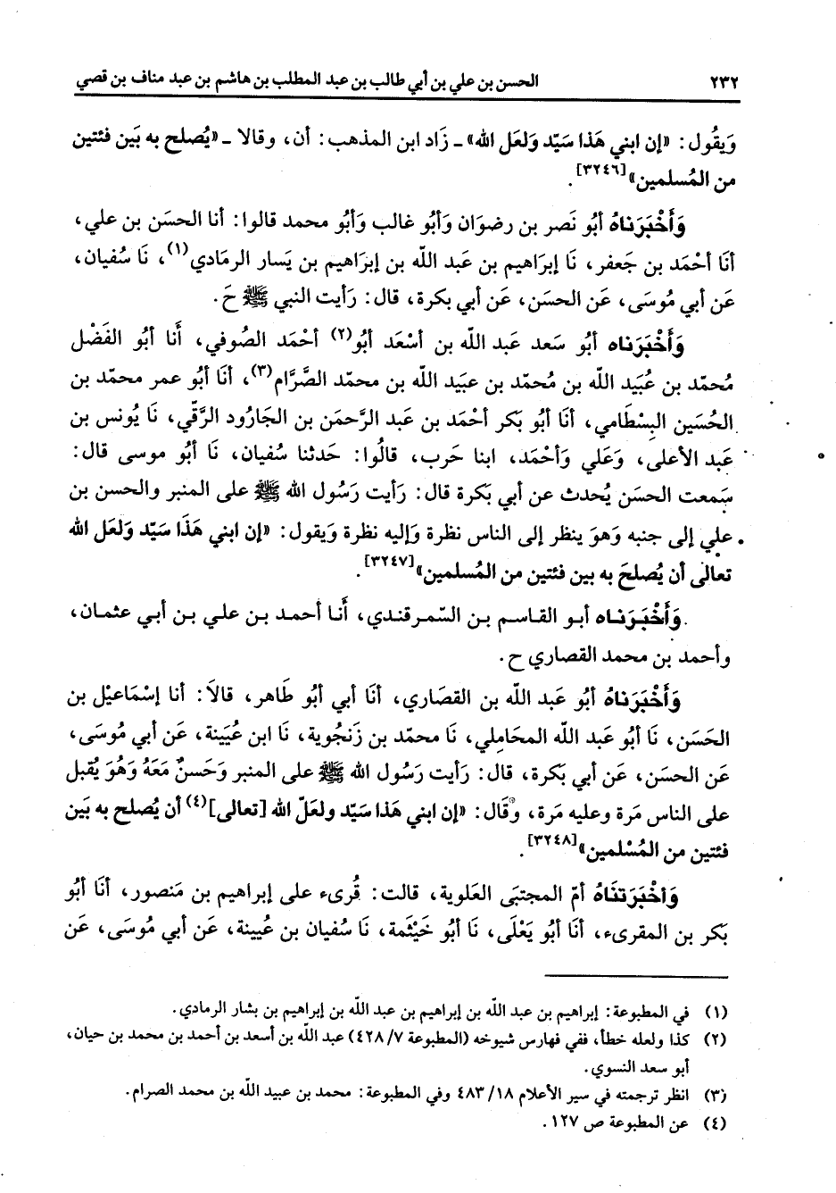 ويقول إن ابني هذا سيد ولعل الله زاد ابن المذهب أن وقالا يصلح به بين فئتين من المسلمين واخبرناه أبو نصر بن رضوان وأبو غالب وأبو محمد قالوا أنا الحسن بن علي أنا احمد بن جعفر نا إبراهيم بن عبد الله بن إبراهيم بن يسار الرمادي (1) نا سفيان عن أبي موسى عن الحسن عن أبي بكرة قال رأيت النبي (صلى الله عليه وسلم) واخبرناه أبو سعد عبد الله بن اسعد أبو (2) احمد الصوفي أنا أبو الفضل محمد بن عبيد الله بن محمد بن عبيد الله بن محمد الصرام (3) أنا أبو عمر محمد بن الحسين البسطامي أنا أبو بكر احمد بن عبد الرحمن بن الجارود الرقي نا يونس بن عبد الاعلى وعلي واحمد ابنا حرب قالوا حدثنا سفيان نا أبو موسى قال سمعت الحسن يحدث عن أبي بكرة قال رأيت رسول الله (صلى الله عليه وسلم) على المنبر والحسن بن علي إلى جنبه وهو ينظر إلى الناس نظرة وإليه نظرة ويقول إن ابني هذا سيد ولعل الله تعالى أن يصلح به بين فئتين من المسلمين وأخبرناه أبو القاسم بن السمرقندي أنا احمد بن علي بن أبي عثمان واحمد بن محمد القصاري واخبرناه أبو عبد الله بن القصاري أنا أبي أبو طاهر قالا أنا إسماعيل بن الحسن نا أبو عبد الله المحاملي نا محمد بن زنجوية نا ابن عيينة عن أبي موسى عن الحسن عن أبي بكرة قال رأيت رسول الله (صلى الله عليه وسلم) على المنبر وحسن معه وهو يقبل على الناس مرة وعليه مرة وقال إن ابني هذا سيد ولعل الله تعالى (4) أن يصلح به بين فئتين من المسلمين واخبرتناه أم المجتبي العلوية قالت قرئ على إبراهيم بن منصور أنا أبو بكر بن المقرئ أنا أبو يعلي نا أبو خيثمة نا سفيان بن عيينة عن أبي موسى عن