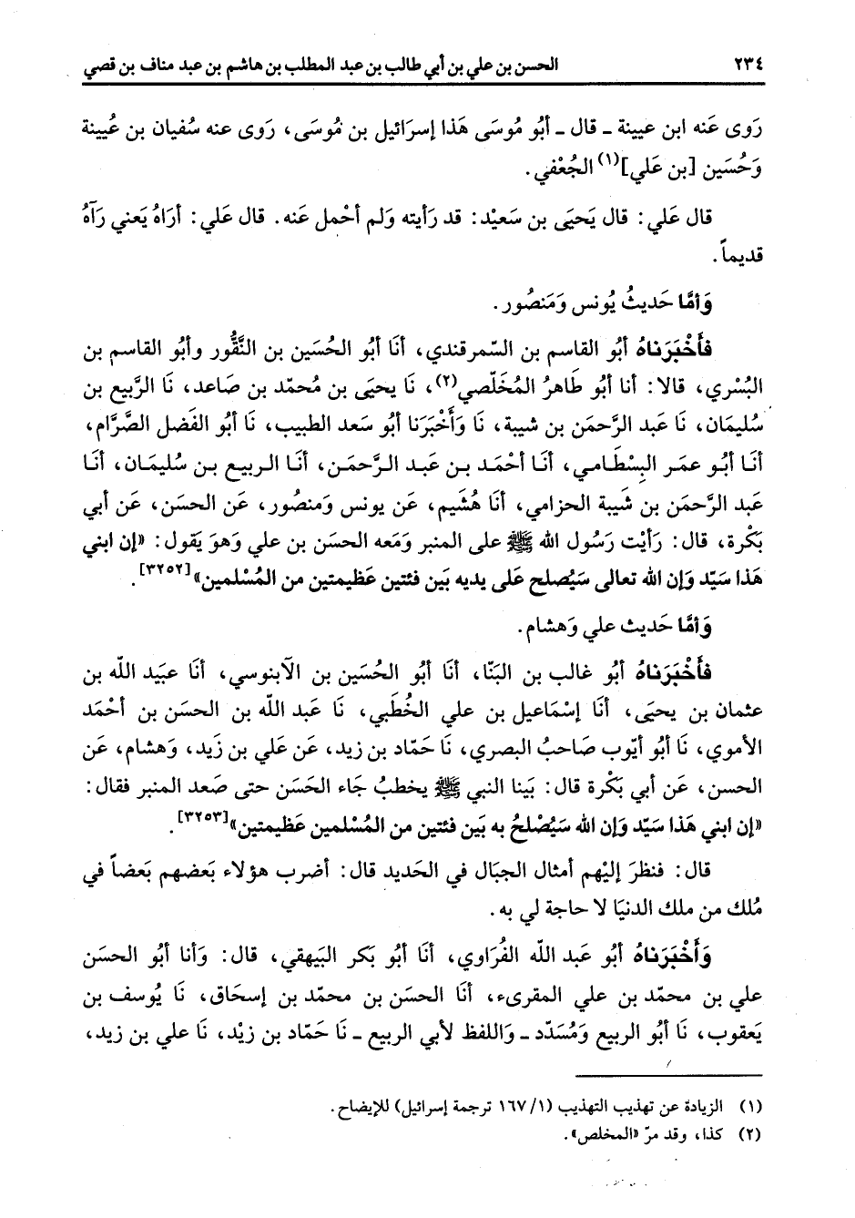 روى عنه ابن عيينة قال أبو موسى هذا إسرائيل بن موسى روى عنه سفيان بن عيينة وحسين بن علي (1) الجعفي قال علي قال يحيى بن سعيد قد رأيته ولم احمل عنه قال علي أراه يعني رآه قديما واما حديث يونس ومنصور فأخبرناه أبو القاسم بن السمرقندي أنا أبو الحسين بن النقور وأبو القاسم بن البسري قالا أنا أبو طاهر المخلصي (2) نا يحيى بن محمد بن صاعد نا الربيع بن سليمان نا عبد الرحمن بن شيبة نا واخبرنا أبو سعد الطبيب نا أبو الفضل الصرام أنا أبو عمر البسطامي أنا احمد بن عبد الرحمن أنا الربيع بن سليمان أنا عبد الرحمن بن شيبة الخزامي أنا هشيم عن يونس ومنصور عن الحسن عن أبي بكرة قال رأيت رسول الله (صلى الله عليه وسلم) على المنبر ومعه الحسن بن علي وهو يقول إن ابني هذا سيد وإن الله تعالى سيصلح على يديه بين فئتين عظيمتين من المسلمين واما حديث علي وهشام فأخبرناه أبو غالب بن البنا أنا أبو الحسين بن الابنوسي أنا عبيد الله بن عثمان بن يحيى أنا إسماعيل بن علي الخطبي نا عبد الله بن الحسن بن احمد الاموي نا أبو آيوب صاحب البصري نا حماد بن زيد عن علي بن زيد وهشام عن الحسن عن أبي بكرة قال بينا النبي (صلى الله عليه وسلم) يخطب جاء الحسن حتى صعد المنبر فقال إن ابني هذا سيد وان الله سيصلح به بين فئتين من المسلمين عظيمتين قال فنظر إليهم امثال الجبال في الحديد قال اضرب هؤلاء بعضهم بعضا في ملك من ملك الدنيا لا حاجة لي به واخبرناه أبو عبد الله الفراوي أنا أبو بكر البيهقي قال وأنا أبو الحسن علي بن محمد بن علي المقرئ أنا الحسن بن محمد بن إسحاق نا يوسف بن يعقوب نا أبو الربيع ومسدد واللفظ لأبي الربيع نا حماد بن زيد نا علي بن زيد