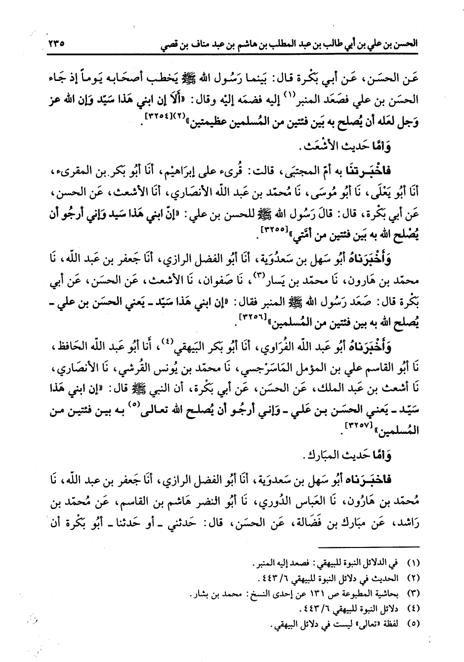 عن الحسن عن أبي بكرة قال بينما رسول الله (صلى الله عليه وسلم) يخطب اصحابه يوما إذ جاء الحسن بن علي فصعد المنبر (1) إليه فضمه إليه وقال ألا إن ابني هذا سيد وان الله عز وجل لعله أن يصلح به بين فئتين من المسلمين عظيمتين (2) واما حديث الاشعت فأخبرتنا به أم المجتبي قالت قرئ على إبراهيم أنا أبو بكر بن المقرئ أنا أبو يعلى نا أبو موسى نا محمد بن عبد الله الأنصاري أنا الاشعت عن الحسن عن أبي بكرة قال قال رسول الله (صلى الله عليه وسلم) للحسن بن علي إن ابني هذا سيد واني أرجو أن يصلح الله به بين فئتين من امتي واخبرناه أبو سهل بن سعدوية أنا أبو الفضل الرازي أنا جعفر بن عبد الله نا محمد بن هارون نا محمد بن يسار (3) نا صفوان نا الاشعت عن الحسن عن أبي بكرة قال صعد رسول الله (صلى الله عليه وسلم) المنبر فقال أن ابني هذا سيد يعني الحسن بن علي يصلح الله به بين فئتين من المسلمين واخبرناه أبو عبد الله الفراوي أنا أبو بكر البيهقي (4) أنا أبو عبد الله الحافظ نا أبو القاسم علي بن المؤمل الماسرجسي نا محمد بن يونس القرشي نا الأنصاري نا اشعث بن عبد الملك عن الحسن عن أبي بكرة أن النبي (صلى الله عليه وسلم) قال إن ابني هذا سيد يعني الحسن بن علي واني أرجو أن يصلح الله تعالى (5) به بين فئتين من المسلمين واما حديث المبارك فأخبرناه أبو سهل بن سعدوية أنا أبو الفضل الرازي أنا جعفر بن عبد الله نا محمد بن هارون نا العباس الدوري نا أبو النضر هاشم بن القاسم عن محمد بن راشد عن مبارك بن فضالة عن الحسن قال حدثني أو حدثنا أبو بكرة أن