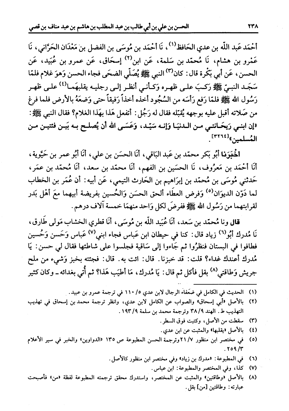 احمد عبد الله بن عدي الحافظ (1) نا احمد بن موسى بن الفضل بن معدان الحراني نا عمرو بن هشام نا محمد بن سلمة عن ابن (2) إسحاق عن عمرو بن عبيد عن الحسن عن أبي بكرة قال كان (3) النبي (صلى الله عليه وسلم) يصلي الضحى فجاء الحسن وهو غلام فلما سجد النبي (صلى الله عليه وسلم) ركب على ظهره وكأني انظر إلى رجليه يقلبهما (4) على ظهر رسول الله (صلى الله عليه وسلم) فلما رفع رأسه من السجود اخذه أخذا رفيقا حتى وضعه بالأرض فلما فرغ من صلاته اقبل عليه بوجهه يقبله فقال له رجل اتفعل هذا بهذا الغلام فقال النبي (صلى الله عليه وسلم) إن ابني ريحانتي من الدنيا وانه سيد وعسى الله أن يصلح بن بين فئتين من المسلمين اخبرنا أبو بكر محمد بن عبد الباقي أنا الحسن بن علي أنا أبو عمر بن حيوية أنا احمد بن معروف نا الحسين بن الفهم أنا محمد بن سعد أنا محمد بن عمر حدثني موسى بن محمد بن إبراهيم بن الحارث التيمي عن أبيه عن أبيه أن عمر بن الخطاب لما دون الديوان (5) وفرض العطاء الحق الحسن والحسين بفريضة ابيهما مع أهل بدر لقرابتهما من رسول الله (صلى الله عليه وسلم) ففرض لكل واحد منهما خمسة آلاف درهم قال ونا محمد بن سعد أنا عبيد الله بن موسى أنا قطري الخشاب مولى طارق نا مدرك أبو (6) زياد قال كنا في حيطان ابن عباس فجاء ابني (7) عباس وحسن وحسين فطافوا في البستان فنظروا ثم جاءوا إلى ساقيه فجلسوا على شاطئها فقال لي حسن يا مدرك اعندك غداء قلت قد خبزنا قال ائت به قال فجئته بخبز وشئ من ملح جريش وطاقتي (8) بقل فأكل ثم قال يا مدرك ما اطيب هذا ثم اتي بغدائه وكان كثير