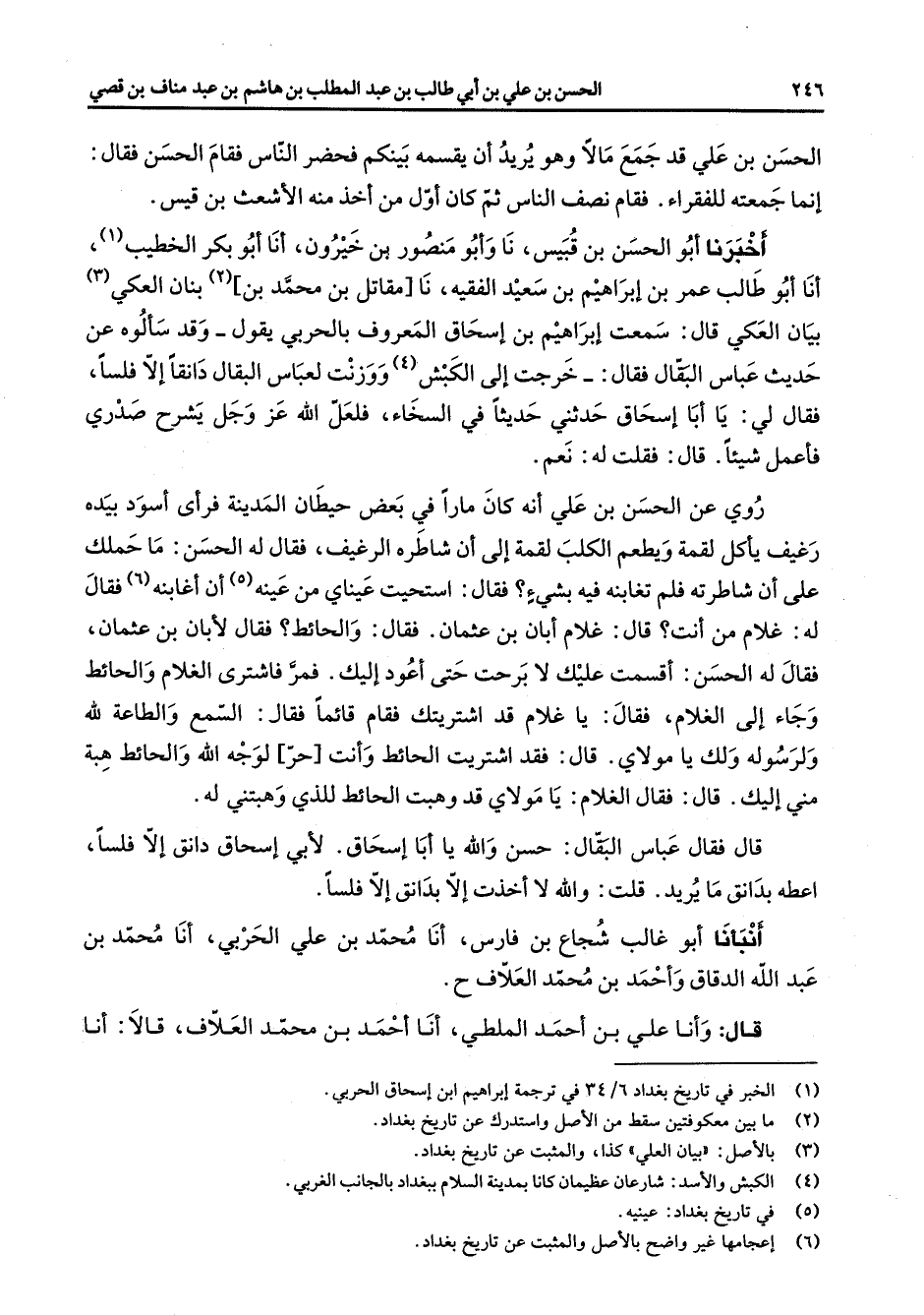 الحسن بن علي قد جمع مالا وهو يريد أن يقسمه بينكم فحضر الناس فقام الحسن فقال إنما جمعته للفقراء فقام نصف الناس ثم كان أول من اخذ منه الاشعت بن قيس اخبرنا أبو الحسن بن قبيس نا وأبو منصور بن خيرون أنا أبو بكر الخطيب (1) أنا أبو طالب عمر بن إبراهيم بن سعيد الفقيه نا مقاتل بن محمد (2) بن بنان العكي (3) بيان العكي قال سمعت إبراهيم بن إسحاق المعروف بالحربي يقول وقد سألوه عن حديث عباس البقال فقال خرجت إلى الكبش (4) ووزنت لعباس البقال دانقا إلا فلسا فقال لي يا أبا إسحاق حدثني حديثا في السخاء فلعل الله عز وجل يشرح صدري فأعمل شيئا قال فقلت له نعم روي عن الحسن بن علي انه كان مارا في بعض حيطان المدينة فرأى اسود بيده رغيف يأكل لقمة ويطعم الكلب إلى أن شاطره الرغيف فقال له الحسن ما حملك على أن شاطرته فلم تغابنه فيه بشئ فقال استحيت عيناي من عينه (5) أن اغابنه (6) فقال له غلام من أنت قال غلام ابان بن عثمان فقال والحائط فقال لابان بن عثمان فقال له الحسن اقسمت عليك لا برحت حتى اعود اليك فمر فاشترى الغلام والحائط وجاء إلى الغلام فقال يا غلام قد اشتريتك فقام قائما فقال السمع والطاعة الله ولرسوله ولك يا مولاي قال فقد اشتريت الحائط وأنت حر لوجه الله والحائط هبة مني اليك قال فقال الغلام يا مولاي قد وهبت الحائط للذي وهبتني له قال فقال عباس البقال حسن والله يا أبا إسحاق لأبي إسحاق دانق إلا فلسا اعطه بدانق ما يريد قلت والله لا أخذت إلا بدانق إلا فلسا أنبأنا أبو غالب شجاع بن فارس أنا محمد بن علي الحربي أنا محمد بن عبد الله الدقاق واحمد بن محمد العلاف قال وأنا علي بن احمد الملطي أنا احمد بن محمد العلاف قالا أنا